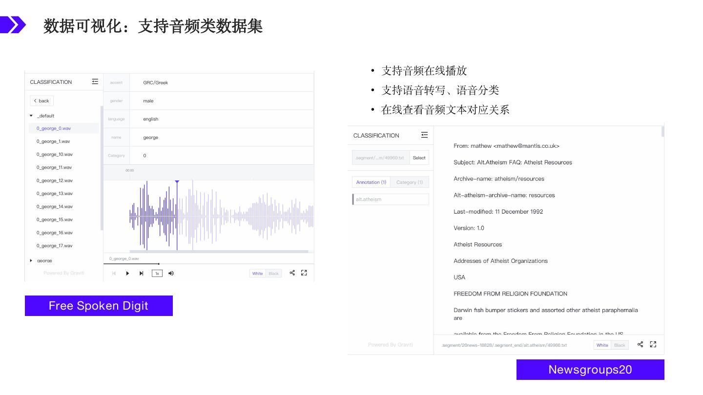 19 .数据可视化:支持音频类数据集 • 支持音频在线播放 • 支持语音转写、语音分类 • 在线查看音频文本对应关系 Free Spoken Digit Newsgroups20