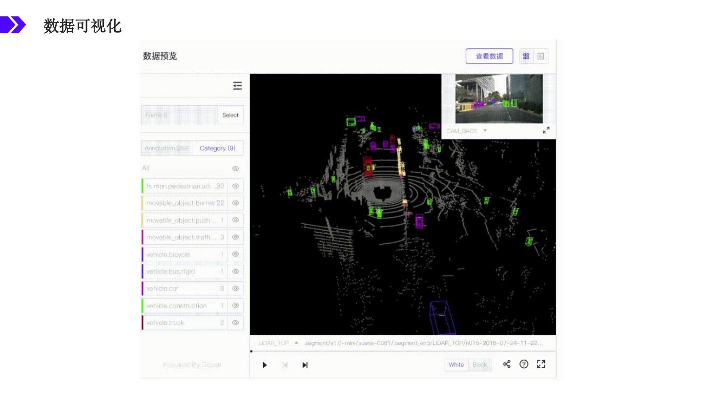 18 .数据可视化:支持融合追踪等复杂场景 • 支持多传感器数据、标注交互展示 • 支持多种点云格式,三维交互展示 • 支持追踪标注,数据、标注连续帧播放 • 组件灵活分享展示,快速了解数据样例 KITTI nuScenes
