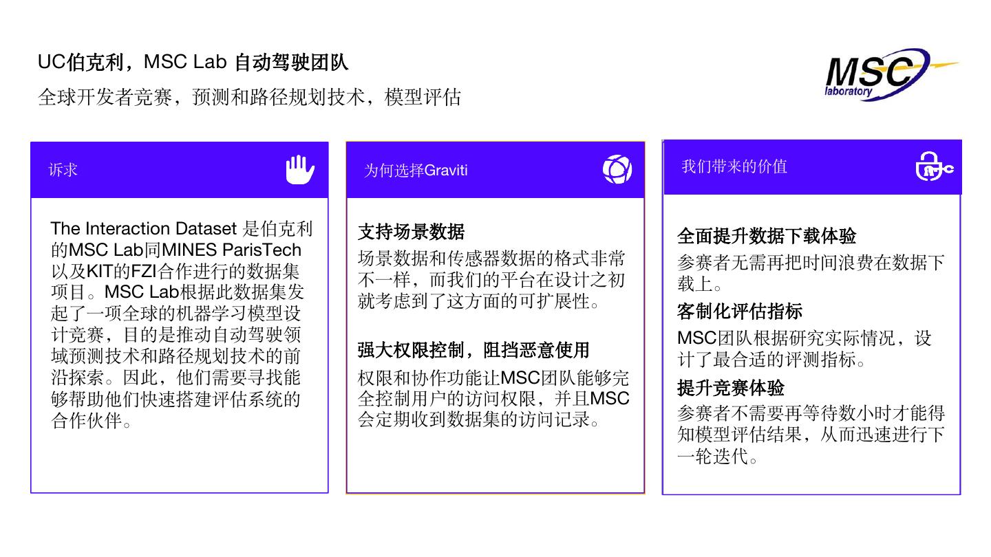 29 .UC伯克利,MSC Lab 自动驾驶团队 全球开发者竞赛,预测和路径规划技术,模型评估 诉求 为何选择Graviti 我们带来的价值 The Interaction Dataset 是伯克利 支持场景数据 全面提升数据下载体验 的MSC Lab同MINES ParisTech 场景数据和传感器数据的格式非常 参赛者无需再把时间浪费在数据下 以及KIT的FZI合作进行的数据集 不一样,而我们的平台在设计之初 项目。MSC Lab根据此数据集发 载上。 就考虑到了这方面的可扩展性。 起了一项全球的机器学习模型设 客制化评估指标 计竞赛,目的是推动自动驾驶领 MSC团队根据研究实际情况,设 域预测技术和路径规划技术的前 强大权限控制,阻挡恶意使用 计了最合适的评测指标。 沿探索。因此,他们需要寻找能 权限和协作功能让MSC团队能够完 提升竞赛体验 够帮助他们快速搭建评估系统的 全控制用户的访问权限,并且MSC 合作伙伴。 会定期收到数据集的访问记录。 参赛者不需要再等待数小时才能得 知模型评估结果,从而迅速进行下 一轮迭代。