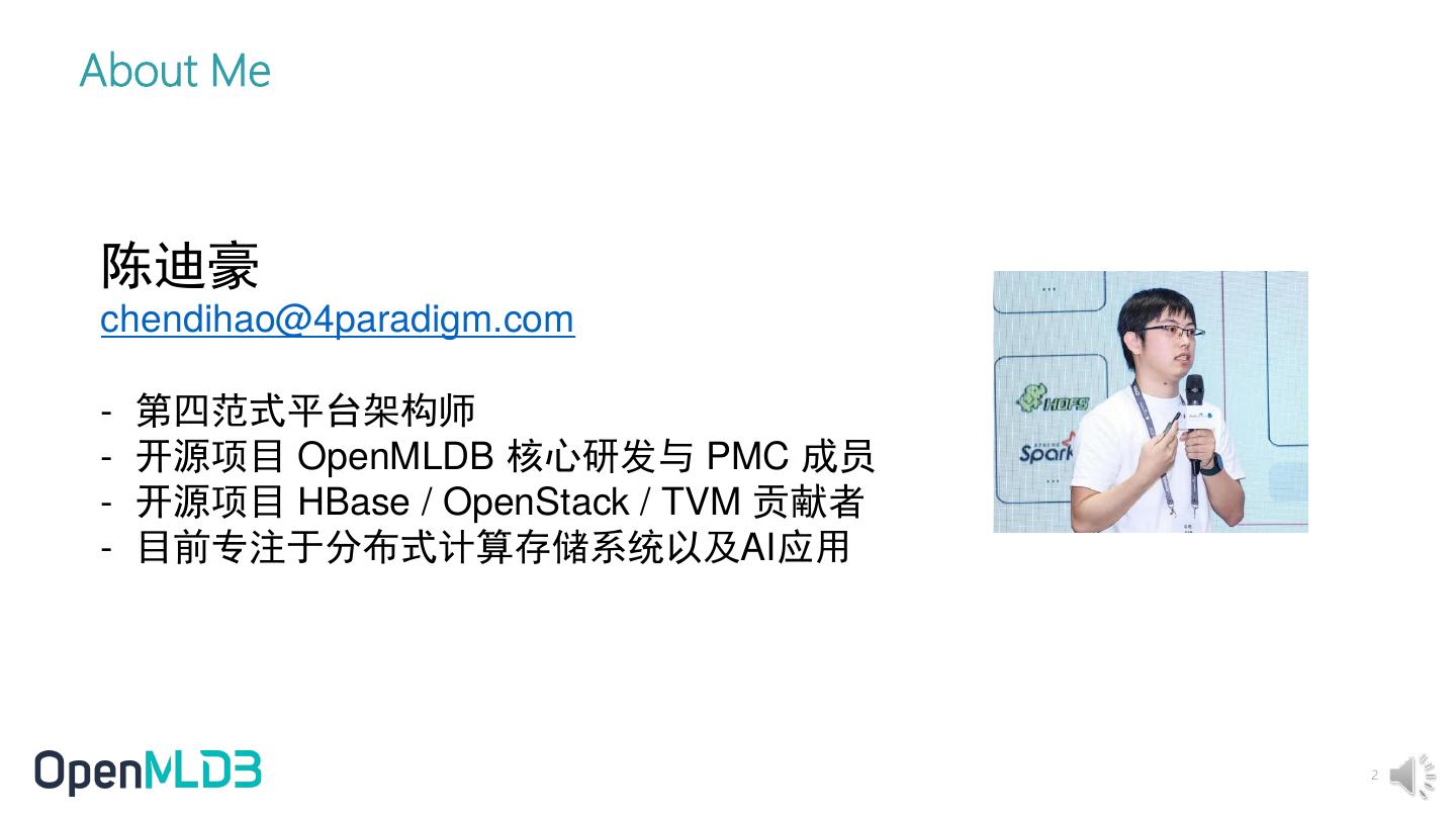 2 .About Me 陈迪豪 chendihao@4paradigm.com - 第四范式平台架构师 - 开源项目 OpenMLDB 核心研发与 PMC 成员 - 开源项目 HBase / OpenStack / TVM 贡献者 - 目前专注于分布式计算存储系统以及AI应用 2