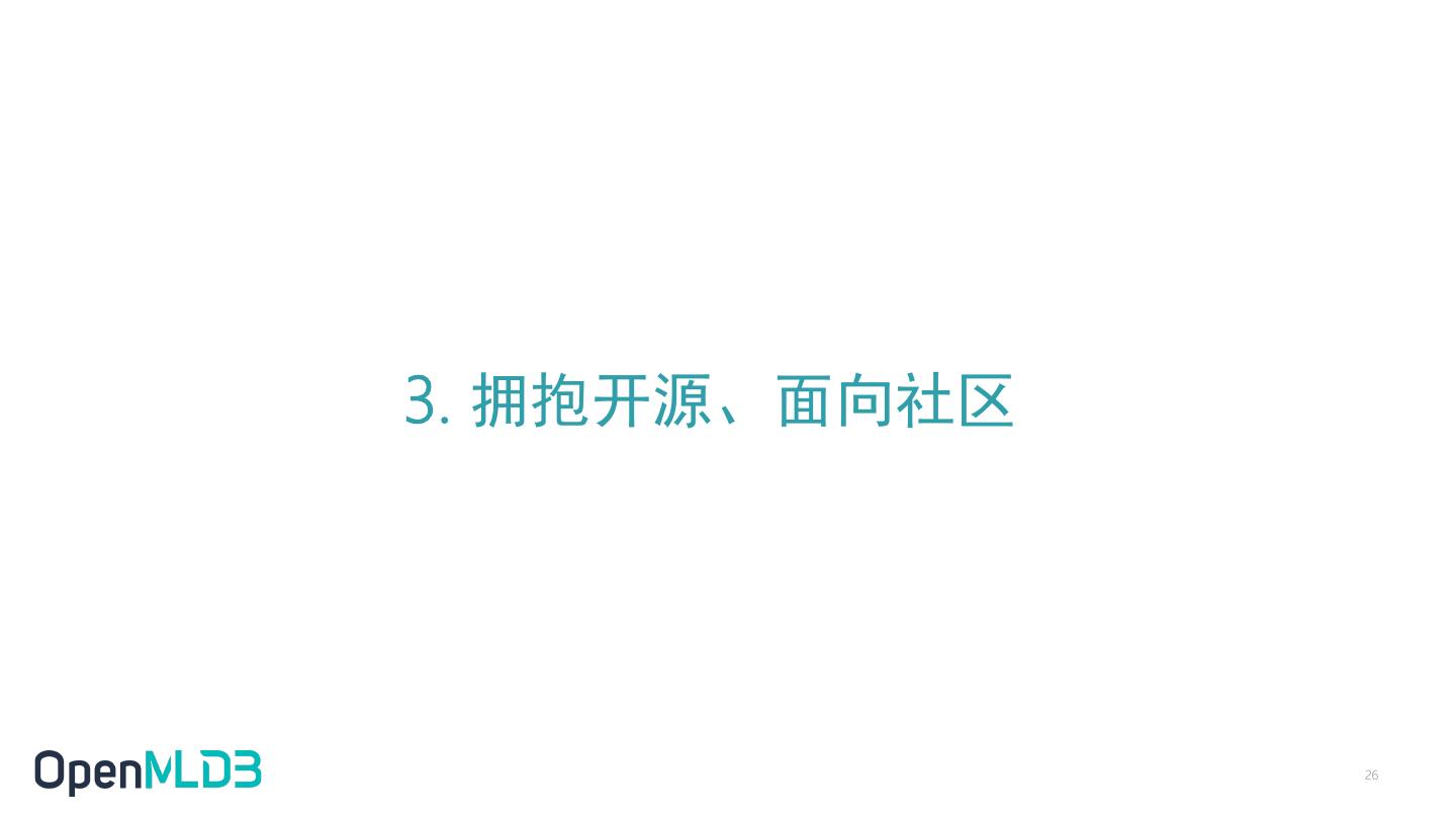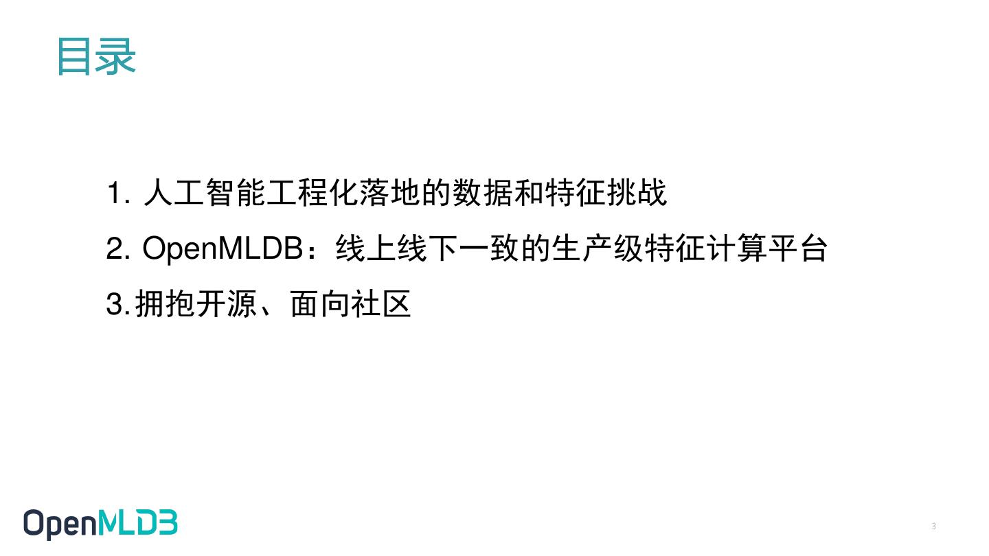 3 .目录 1. 人工智能工程化落地的数据和特征挑战 2. OpenMLDB:线上线下一致的生产级特征计算平台 3.拥抱开源、面向社区 3