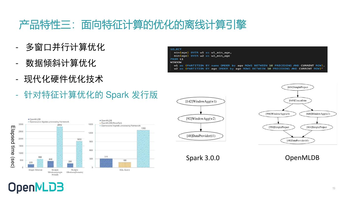 19 . 产品特性三:面向特征计算的优化的离线计算引擎 - 多窗口并行计算优化 - 数据倾斜计算优化 - 现代化硬件优化技术 - 针对特征计算优化的 Spark 发行版 Elapsed time (sec) Spark 3.0.0 OpenMLDB 19