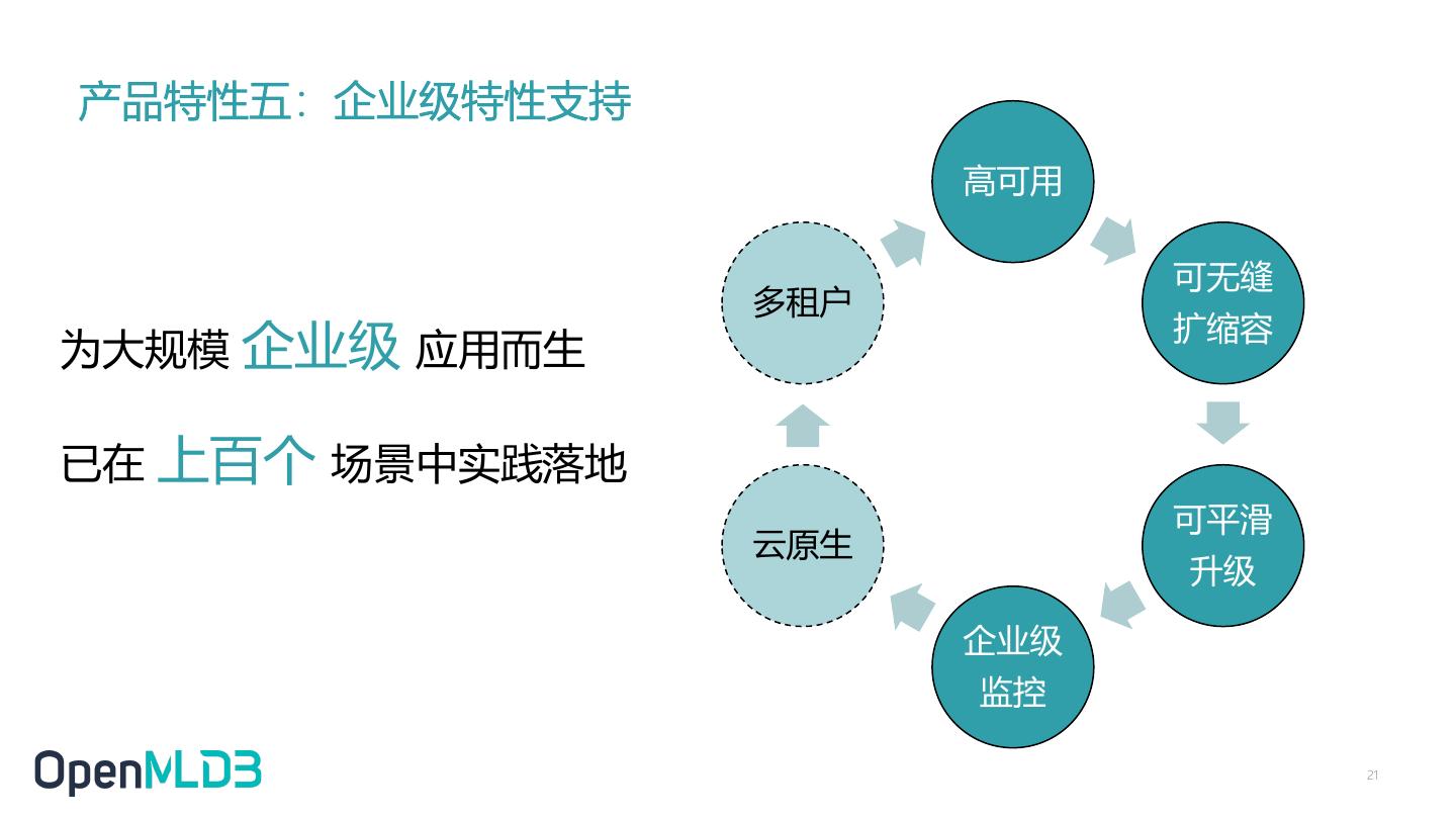 21 .产品特性五:企业级特性支持 高可用 可无缝 多租户 扩缩容 为大规模 企业级 应用而生 已在 上百个 场景中实践落地 可平滑 云原生 升级 企业级 监控 21