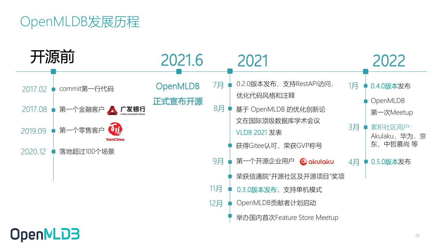 27 . 过往5年 MLDB → OpenMLDB 在 100+场景 落地,覆盖超过 300个节点 信用卡现金分期精准营销 贷前风险评分 营销获客 个性化推荐 反洗钱可疑交易智能识别 信用卡账户风险预警 合规额度决策 风险管理 投顾客户挖掘 信用卡申请反欺诈 欺诈养卡防控 理财个性化推荐 零售贷款反欺诈 历史客户激活 客户流失预警 网点流量预测 交易欺诈评分 现金分期个性化推荐 信用卡交易反欺诈 金融产品推荐 27