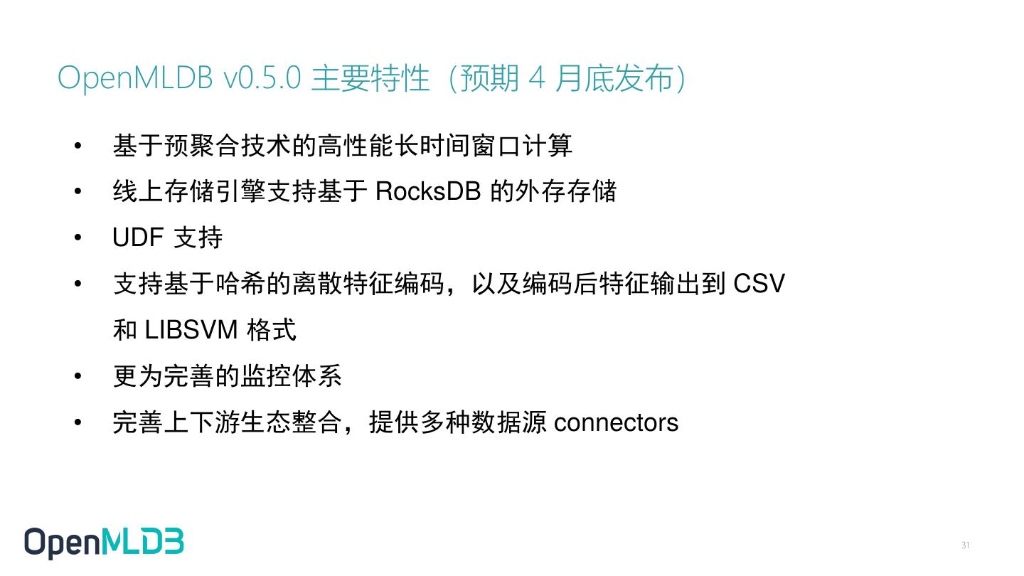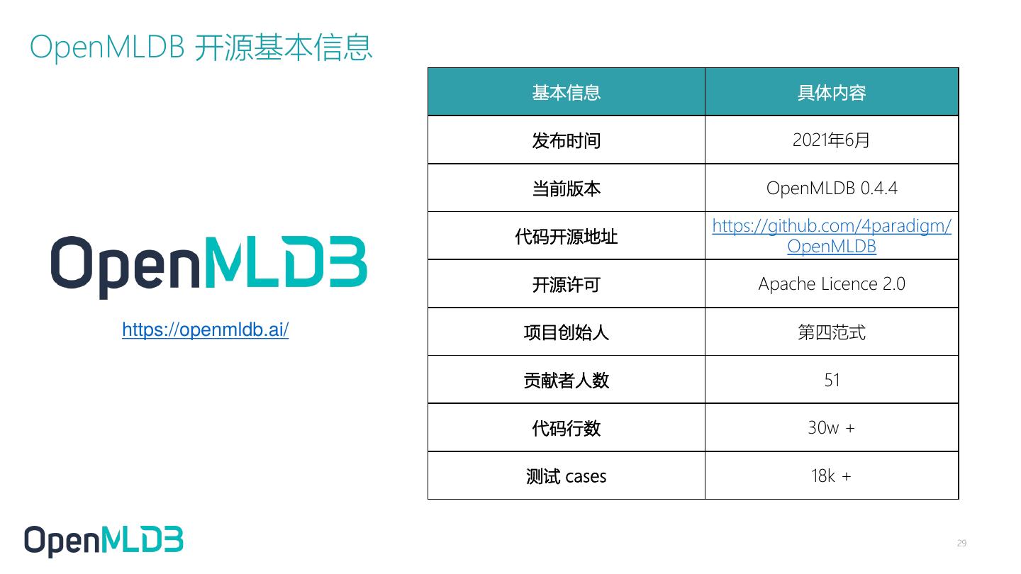 29 .OpenMLDB 开源基本信息 基本信息 具体内容 发布时间 2021年6月 当前版本 OpenMLDB 0.4.4 https://github.com/4paradigm/ 代码开源地址 OpenMLDB 开源许可 Apache Licence 2.0 https://openmldb.ai/ 项目创始人 第四范式 贡献者人数 51 代码行数 30w + 测试 cases 18k + 29