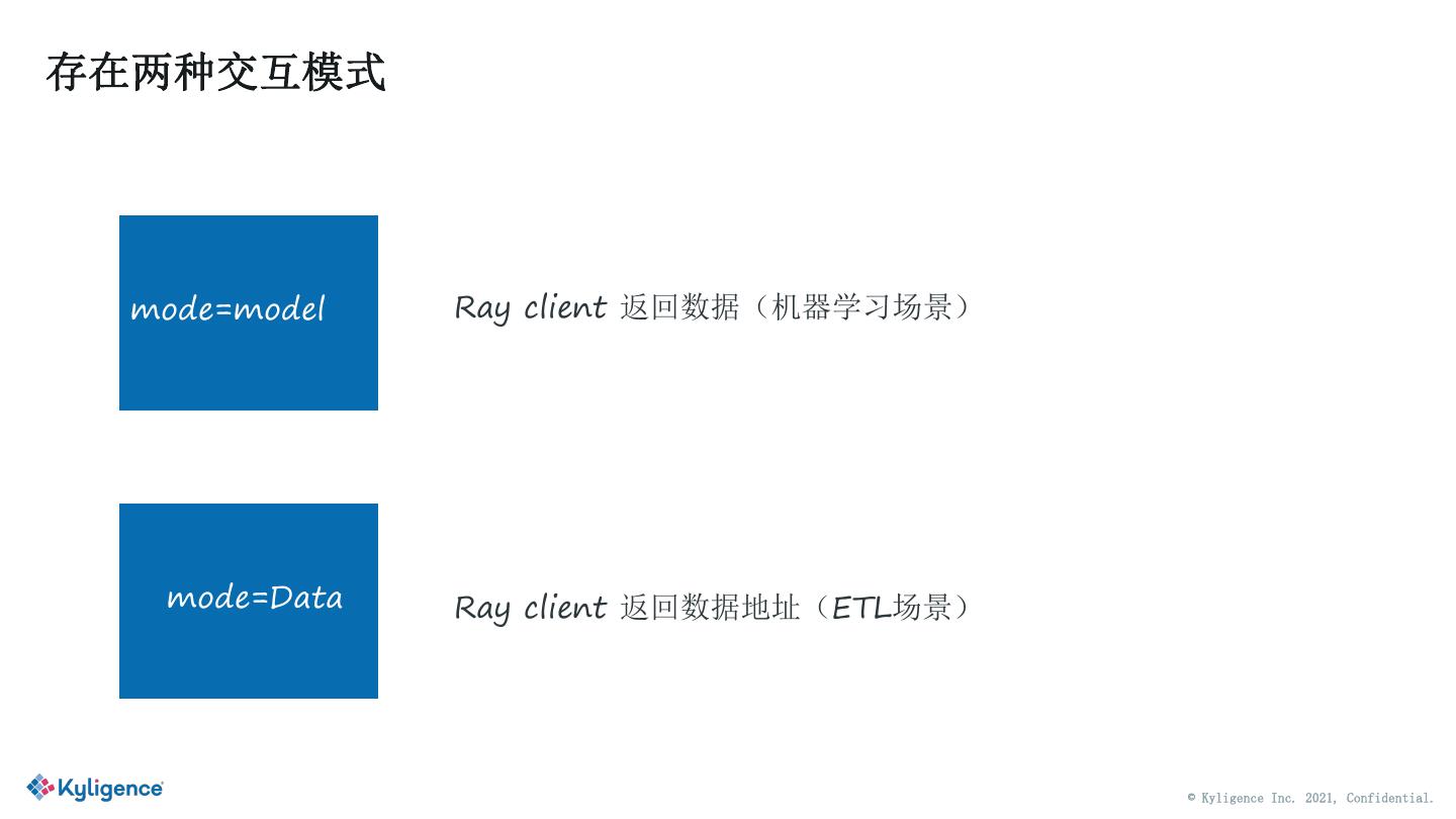 8 .存在两种交互模式 mode=model Ray client 返回数据(机器学习场景) mode=Data Ray client 返回数据地址(ETL场景) © Kyligence Inc. 2021, Confidential.