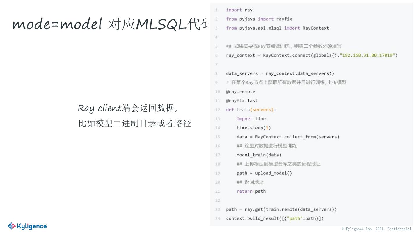 10 .mode=model 对应MLSQL代码 Ray client端会返回数据, 比如模型二进制目录或者路径 © Kyligence Inc. 2021, Confidential.