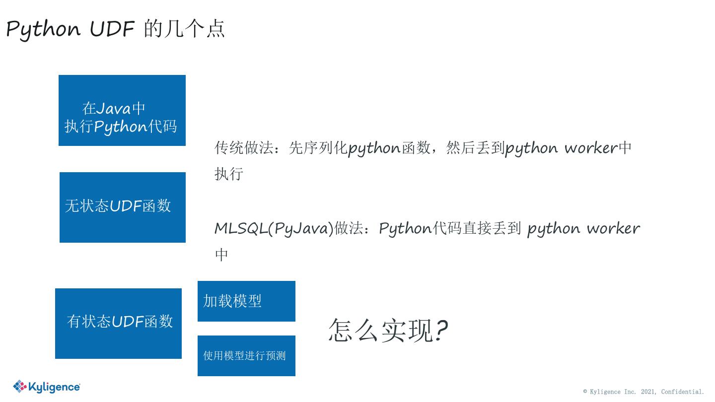 16 .有状态UDF函数实现初步设想 HTTP UDF UDF Worker Worker UDF UDF Worker Worker 本质是启动一个ML Serving集群,提供 PRC, HTTP支持 UDF UDF Worker Worker RPC © Kyligence Inc. 2021, Confidential.