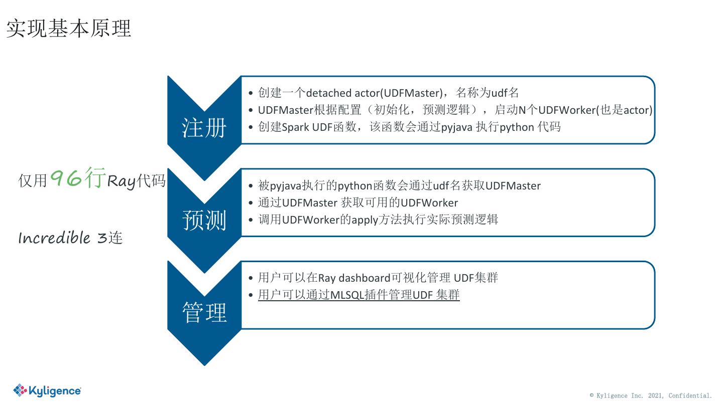 19 .实现基本原理 • 创建一个detached actor(UDFMaster),名称为udf名 • UDFMaster根据配置(初始化,预测逻辑),启动N个UDFWorker(也是actor) 注册 • 创建Spark UDF函数,该函数会通过pyjava 执行python 代码 仅用96行Ray代码 • 被pyjava执行的python函数会通过udf名获取UDFMaster • 通过UDFMaster 获取可用的UDFWorker 预测 • 调用UDFWorker的apply方法执行实际预测逻辑 Incredible 3连 • 用户可以在Ray dashboard可视化管理 UDF集群 • 用户可以通过MLSQL插件管理UDF 集群 管理 © Kyligence Inc. 2021, Confidential.