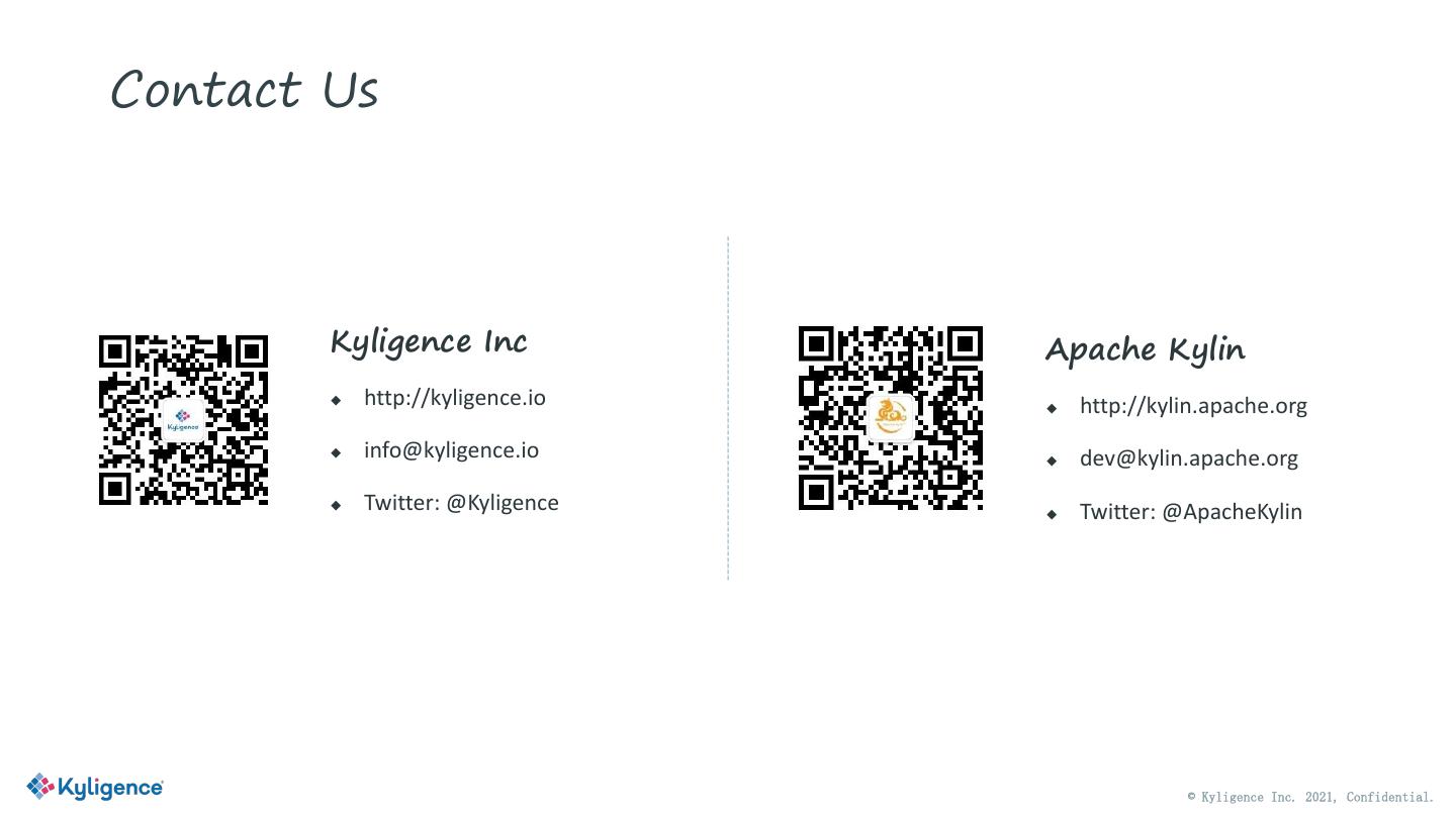 26 .Contact Us Kyligence Inc Apache Kylin u http://kyligence.io u http://kylin.apache.org u info@kyligence.io u dev@kylin.apache.org u Twitter: @Kyligence u Twitter: @ApacheKylin © Kyligence Inc. 2021, Confidential.