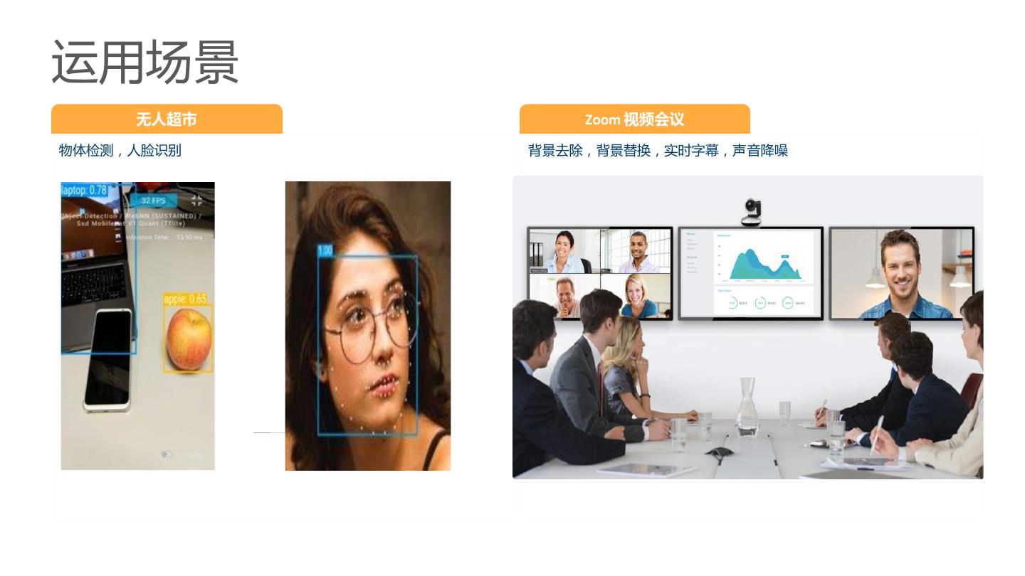 3 .运用场景 无人超市 Zoom 视频会议 物体检测,人脸识别 背景去除,背景替换,实时字幕,声音降噪