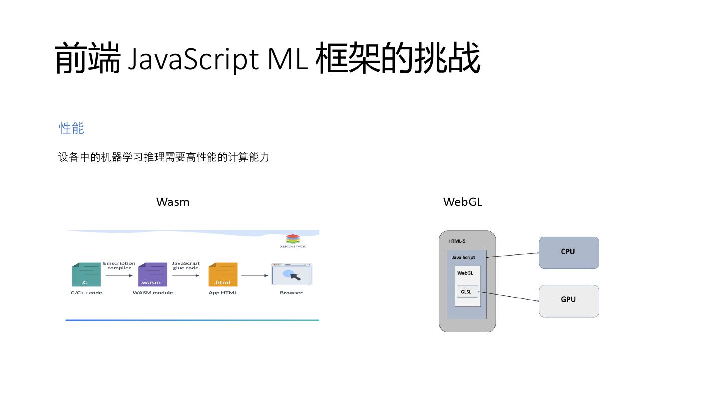 5 .前端 JavaScript ML 框架的挑战 性能 设备中的机器学习推理需要高性能的计算能力 Wasm WebGL