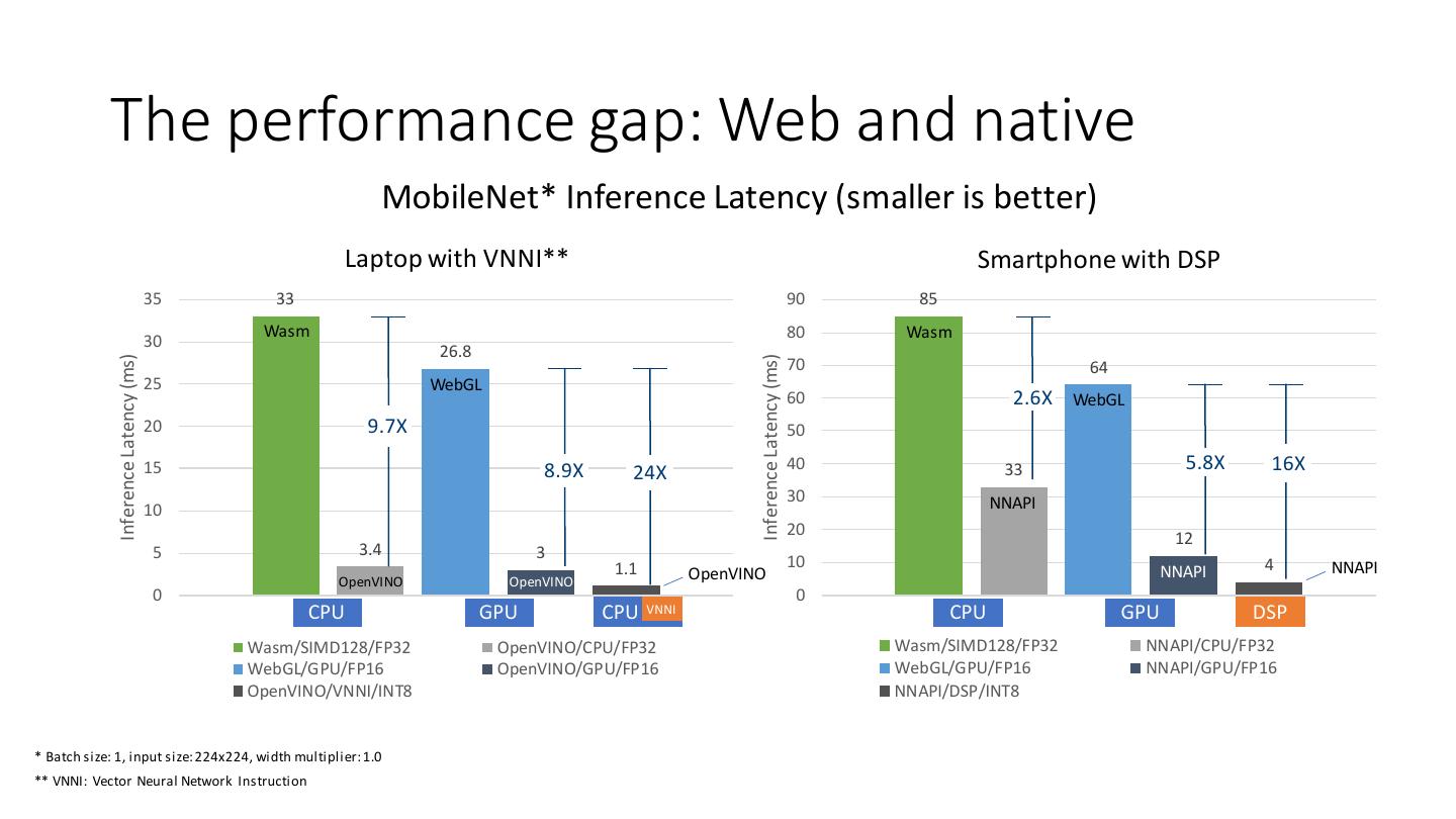 8 . The performance gap: Web and native MobileNet* Inference Latency (smaller is better) Laptop with VNNI** Smartphone with DSP 35 33 90 85 Wasm 80 Wasm 30 26.8 Inference Latency (ms) Inference Latency (ms) 70 64 25 WebGL 60 2.6X WebGL 20 9.7X 50 15 8.9X 24X 40 33 5.8X 16X 30 NNAPI 10 20 12 5 3.4 3 1.1 10 4 NNAPI OpenVINO NNAPI OpenVINO OpenVINO 0 0 CPU GPU CPU VNNI CPU GPU DSP Wasm/SIMD128/FP32 OpenVINO/CPU/FP32 Wasm/SIMD128/FP32 NNAPI/CPU/FP32 WebGL/GPU/FP16 OpenVINO/GPU/FP16 WebGL/GPU/FP16 NNAPI/GPU/FP16 OpenVINO/VNNI/INT8 NNAPI/DSP/INT8 * Batch size: 1, input size: 224x224, width multiplier: 1.0 ** VNNI: Vector Neural Network Instruction