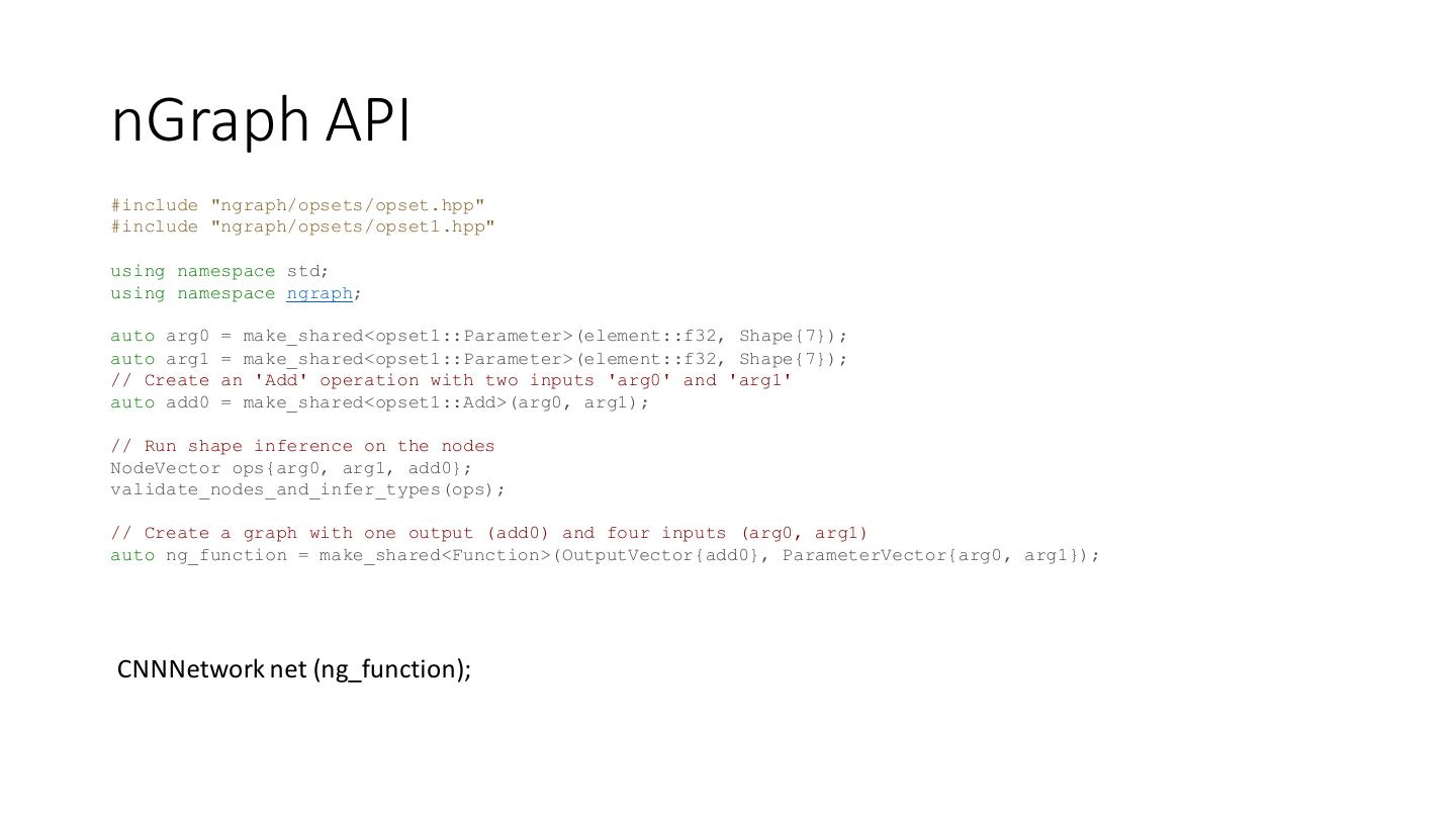 14 .nGraph API #include "ngraph/opsets/opset.hpp" #include "ngraph/opsets/opset1.hpp" using namespace std; using namespace ngraph; auto arg0 = make_shared<opset1::Parameter>(element::f32, Shape{7}); auto arg1 = make_shared<opset1::Parameter>(element::f32, Shape{7}); // Create an 'Add' operation with two inputs 'arg0' and 'arg1' auto add0 = make_shared<opset1::Add>(arg0, arg1); // Run shape inference on the nodes NodeVector ops{arg0, arg1, add0}; validate_nodes_and_infer_types(ops); // Create a graph with one output (add0) and four inputs (arg0, arg1) auto ng_function = make_shared<Function>(OutputVector{add0}, ParameterVector{arg0, arg1}); CNNNetwork net (ng_function);