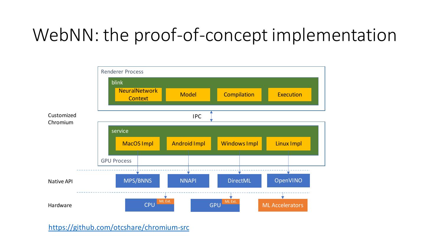 17 .WebNN: the proof-of-concept implementation Renderer Process blink NeuralNetwork Model Compilation Execution Context Customized IPC Chromium service MacOS Impl Android Impl Windows Impl Linux Impl GPU Process Native API MPS/BNNS NNAPI DirectML OpenVINO ML Ext. ML Ext. Hardware CPU GPU ML Accelerators https://github.com/otcshare/chromium-src