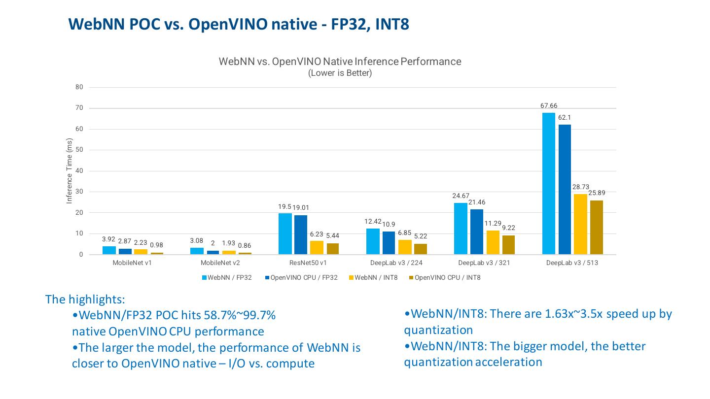 19 . WebNN POC vs. OpenVINO native - FP32, INT8 WebNN vs. OpenVINO Native Inference Performance (Lower is Better) 80 70 67.66 62.1 60 Inference Time (ms) 50 40 28.73 30 25.89 24.67 21.46 19.5 19.01 20 12.42 10.9 11.29 9.22 10 6.23 5.44 6.85 3.92 2.87 5.22 2.23 0.98 3.08 2 1.93 0.86 0 MobileNet v1 MobileNet v2 ResNet50 v1 DeepLab v3 / 224 DeepLab v3 / 321 DeepLab v3 / 513 WebNN / FP32 OpenVINO CPU / FP32 WebNN / INT8 OpenVINO CPU / INT8 The highlights: •WebNN/FP32 POC hits 58.7%~99.7% •WebNN/INT8: There are 1.63x~3.5x speed up by native OpenVINO CPU performance quantization •The larger the model, the performance of WebNN is •WebNN/INT8: The bigger model, the better closer to OpenVINO native – I/O vs. compute quantization acceleration