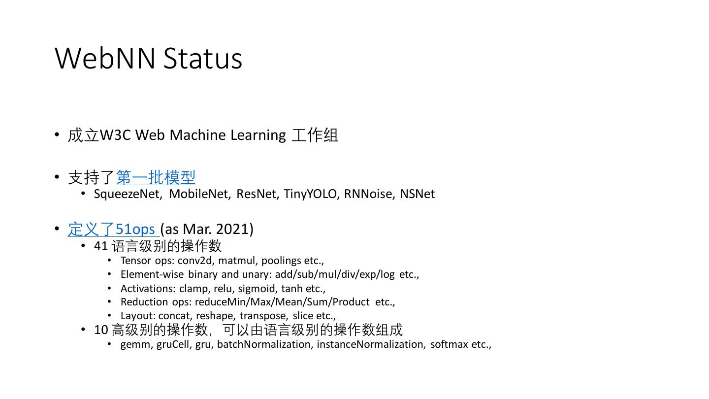 21 .WebNN Status • 成立W3C Web Machine Learning 工作组 • 支持了第一批模型 • SqueezeNet, MobileNet, ResNet, TinyYOLO, RNNoise, NSNet • 定义了51ops (as Mar. 2021) • 41 语言级别的操作数 • Tensor ops: conv2d, matmul, poolings etc., • Element-wise binary and unary: add/sub/mul/div/exp/log etc., • Activations: clamp, relu, sigmoid, tanh etc., • Reduction ops: reduceMin/Max/Mean/Sum/Product etc., • Layout: concat, reshape, transpose, slice etc., • 10 高级别的操作数,可以由语言级别的操作数组成 • gemm, gruCell, gru, batchNormalization, instanceNormalization, softmax etc.,