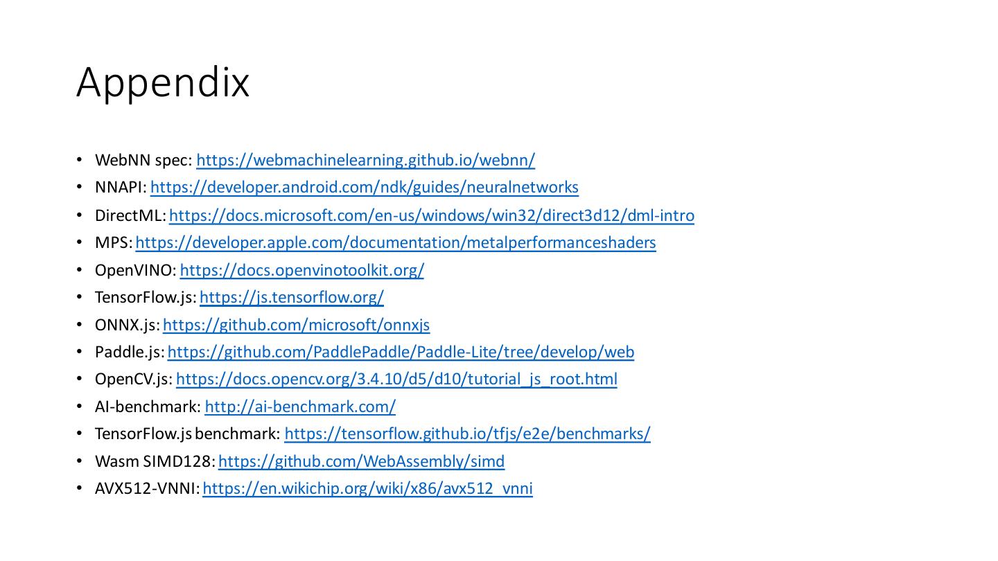 23 .Appendix • WebNN spec: https://webmachinelearning.github.io/webnn/ • NNAPI: https://developer.android.com/ndk/guides/neuralnetworks • DirectML: https://docs.microsoft.com/en-us/windows/win32/direct3d12/dml-intro • MPS: https://developer.apple.com/documentation/metalperformanceshaders • OpenVINO: https://docs.openvinotoolkit.org/ • TensorFlow.js: https://js.tensorflow.org/ • ONNX.js: https://github.com/microsoft/onnxjs • Paddle.js: https://github.com/PaddlePaddle/Paddle-Lite/tree/develop/web • OpenCV.js: https://docs.opencv.org/3.4.10/d5/d10/tutorial_js_root.html • AI-benchmark: http://ai-benchmark.com/ • TensorFlow.js benchmark: https://tensorflow.github.io/tfjs/e2e/benchmarks/ • Wasm SIMD128: https://github.com/WebAssembly/simd • AVX512-VNNI: https://en.wikichip.org/wiki/x86/avx512_vnni