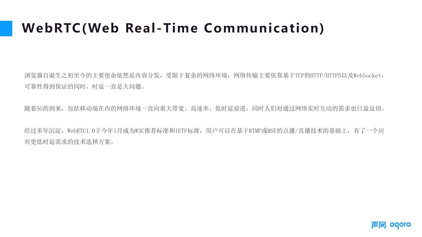 4 .We b RTC ( We b Re a l - T i m e C o m m u n i c a t i o n ) 浏览器自诞生之初至今的主要使命依然是内容分发,受限于复杂的网络环境,网络传输主要依靠基于TCP的HTTP/HTTPS以及WebSocket, 可靠性得到保证的同时,时延一直是大问题。 随着5G的到来,包括移动端在内的网络环境一直向着大带宽、高速率、低时延前进,同时人们对通过网络实时互动的需求也日益迫切。 经过多年沉淀,WebRTC1.0于今年1月成为W3C推荐标准和IETF标准,用户可以在基于RTMP或MSE的点播/直播技术的基础上,有了一个应 对更低时延需求的技术选择方案。