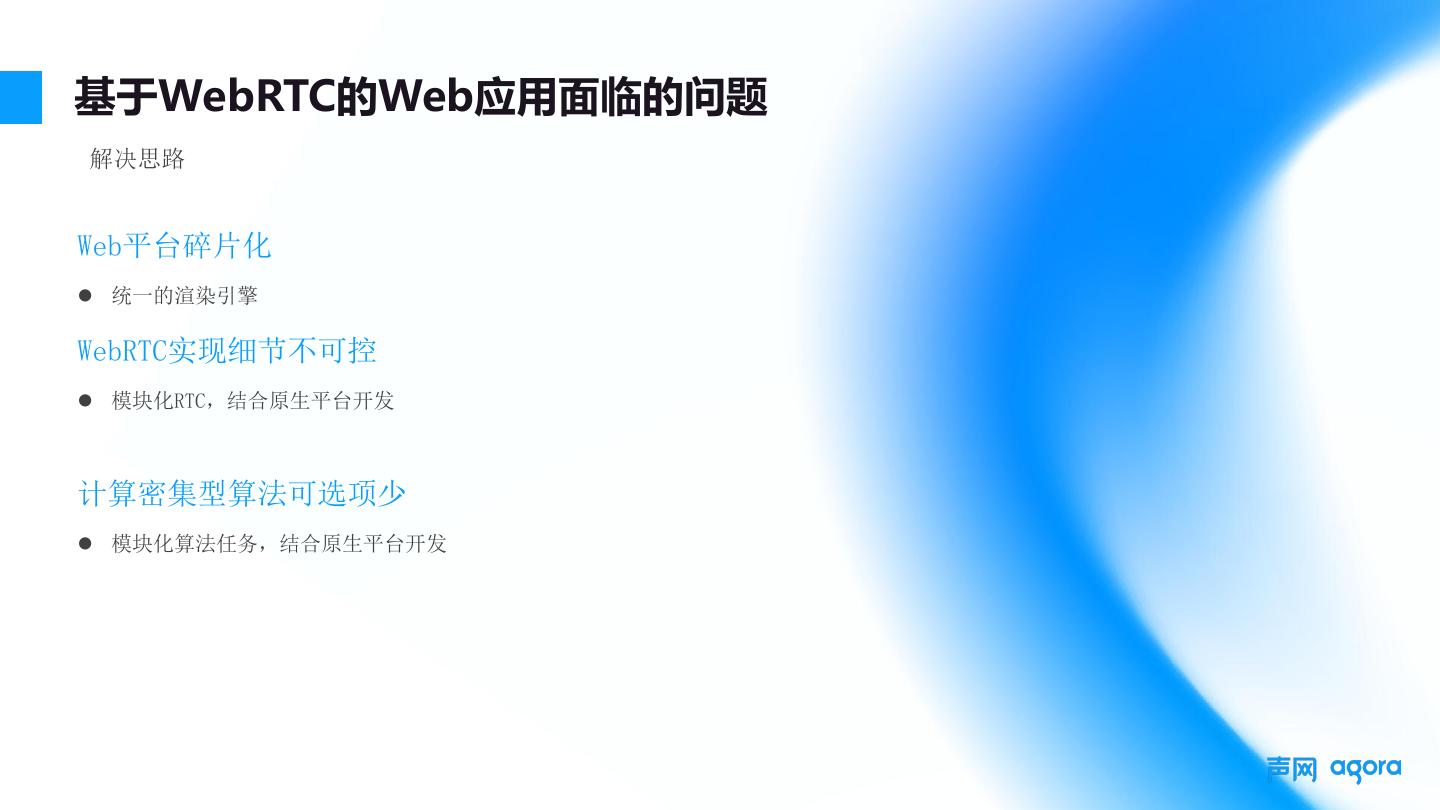 6 .基于WebRTC的Web应用面临的问题 解决思路 Web平台碎片化 l 统一的渲染引擎 WebRTC实现细节不可控 l 模块化RTC,结合原生平台开发 计算密集型算法可选项少 l 模块化算法任务,结合原生平台开发