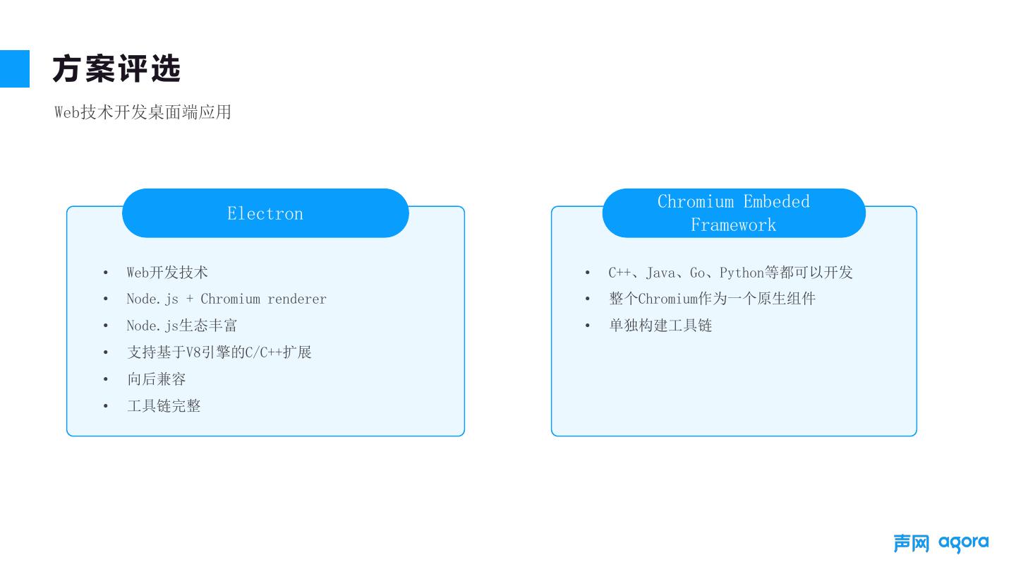 9 .Agora-RTCNG-Electron PC端跨平台混合框架 基于Node Addon的拓展技术 渲染进程 l 代码加载到V8引擎中执行 V8引擎 l 向后兼容Node(V8)版本 l 异步采用事件驱动 用户层接口兼容 Node API Native l 向用户提供接口与Agora RTC NG接口兼容 主线程 SDK 自研Native SDK实现 l 多平台(Windows、MacOS) l 直连RTN l 声网自研功能