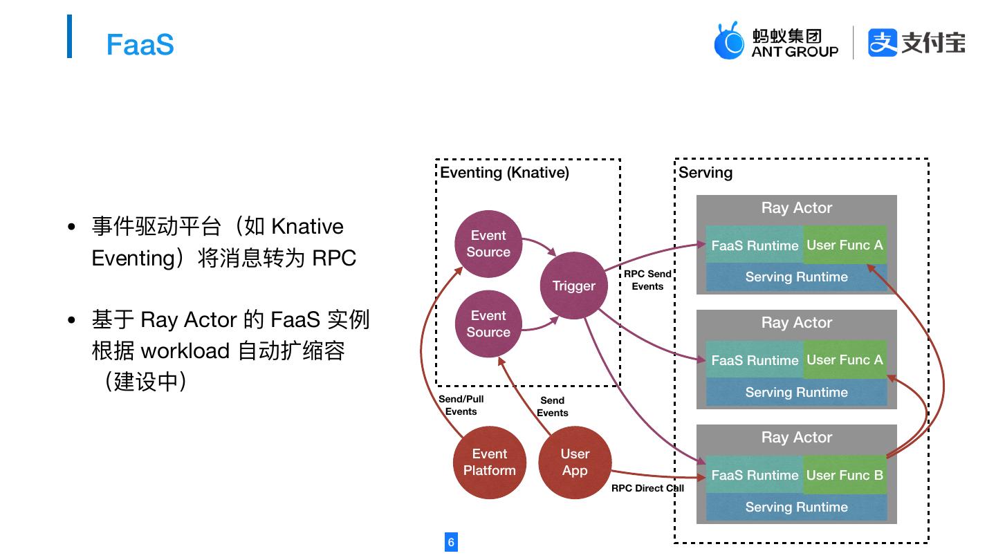 6 . FaaS Eventing (Knative) Serving Ray Actor • 事件驱动平台(如 Knative Event FaaS Runtime User Func A Source Eventing)将消息转为 RPC RPC Send Serving Runtime Trigger Events • 基于 Ray Actor 的 FaaS 实例 Event Source Ray Actor 根据 workload ⾃动扩缩容 FaaS Runtime User Func A (建设中) Serving Runtime Send/Pull Send Events Events Ray Actor Event User Platform App FaaS Runtime User Func B RPC Direct Call Serving Runtime 6
