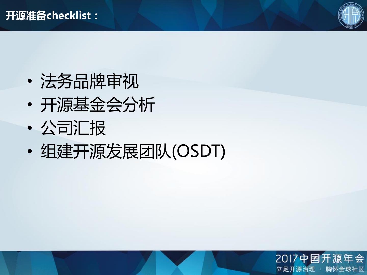 10 .开源准备checklist: • 法务品牌审视 • 开源基金会分析 • 公司汇报 • 组建开源发展团队(OSDT)
