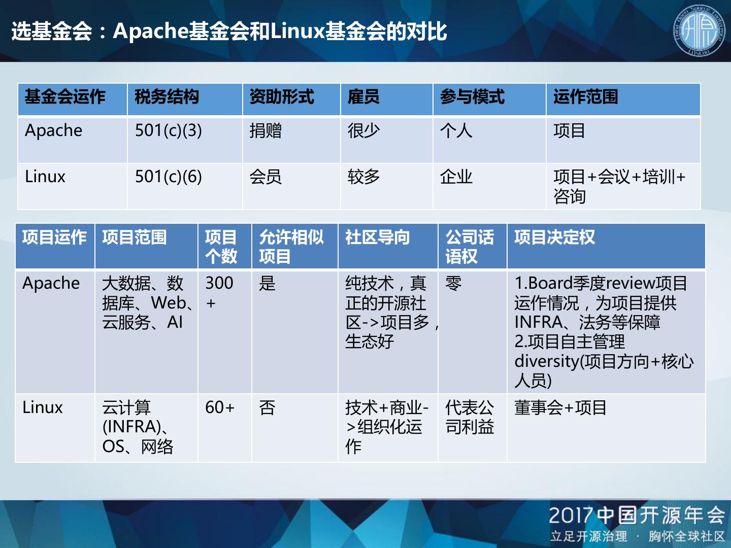 11 .选基金会:Apache基金会和Linux基金会的对比 基金会运作 税务结构 资助形式 雇员 参与模式 运作范围 Apache 501(c)(3) 捐赠 很少 个人 项目 Linux 501(c)(6) 会员 较多 企业 项目+会议+培训+ 咨询 项目运作 项目范围 项目 允许相似 社区导向 公司话 项目决定权 个数 项目 语权 Apache 大数据、数 300 是 纯技术,真 零 1.Board季度review项目 据库、Web、 + 正的开源社 运作情况,为项目提供 云服务、AI 区->项目多, INFRA、法务等保障 生态好 2.项目自主管理 diversity(项目方向+核心 人员) Linux 云计算 60+ 否 技术+商业- 代表公 董事会+项目 (INFRA)、 >组织化运 司利益 OS、网络 作