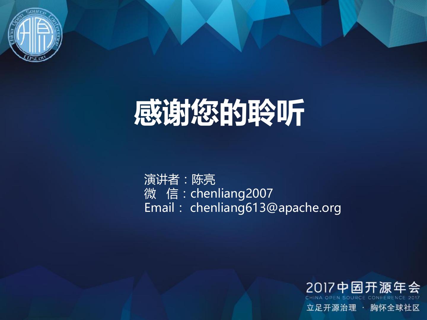 17 .感谢您的聆听 演讲者:陈亮 微 信:chenliang2007 Email: chenliang613@apache.org