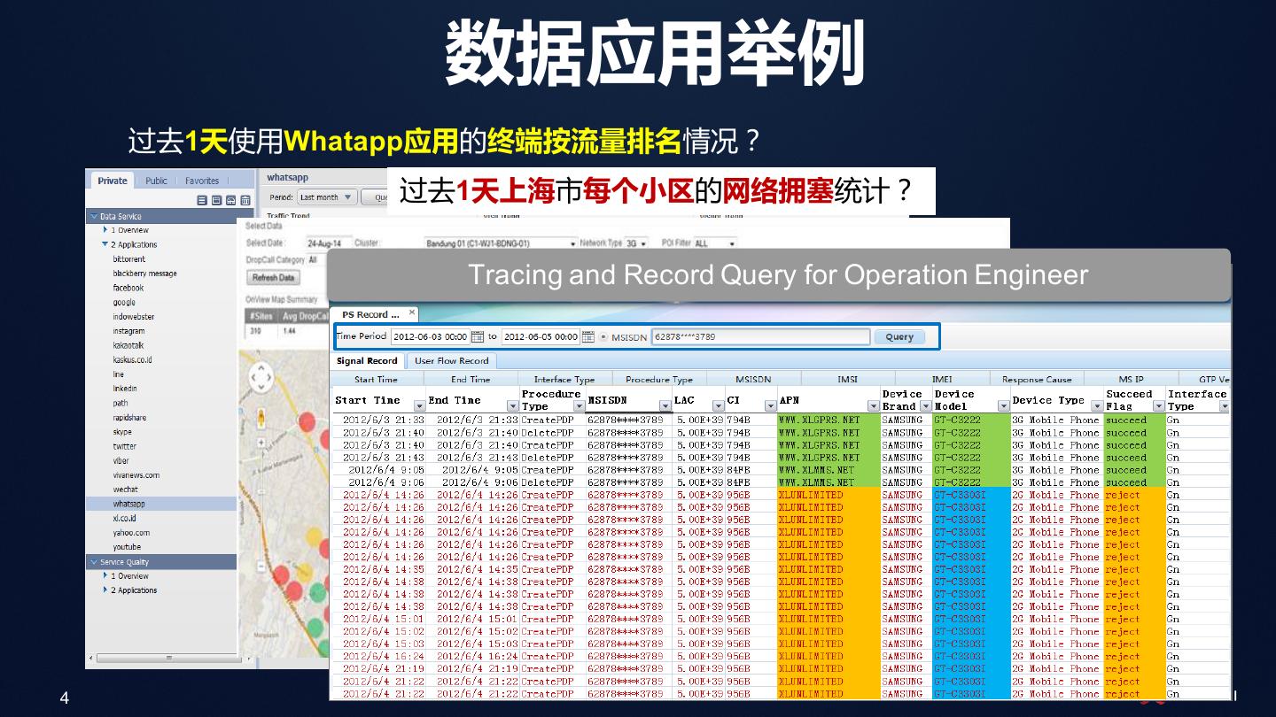 4 . 数据应用举例 过去1天使用Whatapp应用的终端按流量排名情况? 过去1天上海市每个小区的网络拥塞统计? Tracing and Record Query for Operation Engineer 4