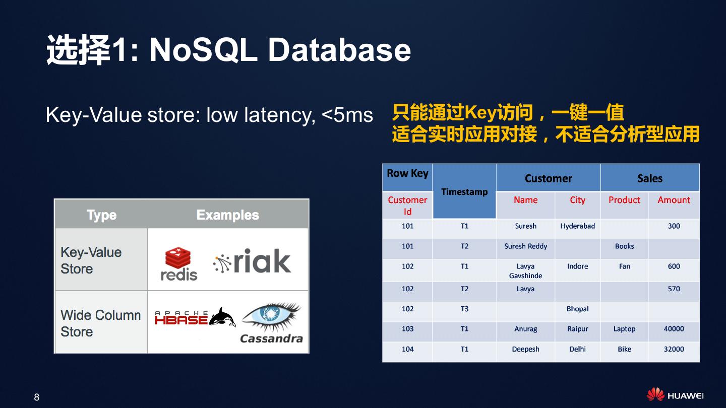 8 . 选择1: NoSQL Database Key-Value store: low latency, <5ms 只能通过Key访问,一键一值 适合实时应用对接,不适合分析型应用 8