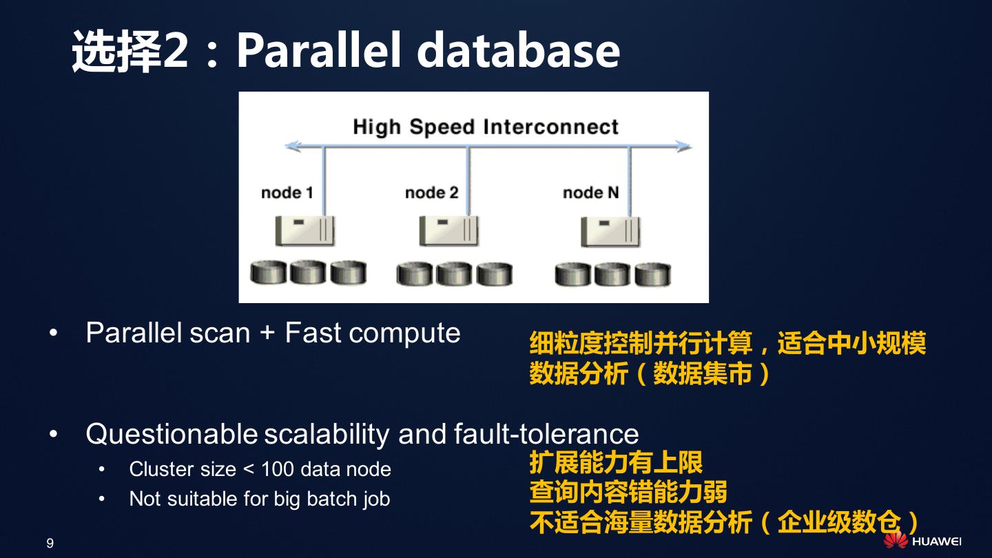 9 . 选择2:Parallel database • Parallel scan + Fast compute 细粒度控制并行计算,适合中小规模 数据分析(数据集市) • Questionable scalability and fault-tolerance • Cluster size < 100 data node 扩展能力有上限 • Not suitable for big batch job 查询内容错能力弱 不适合海量数据分析(企业级数仓) 9
