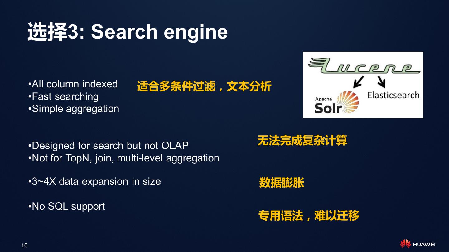 10 . 选择3: Search engine •All column indexed 适合多条件过滤,文本分析 •Fast searching •Simple aggregation •Designed for search but not OLAP 无法完成复杂计算 •Not for TopN, join, multi-level aggregation •3~4X data expansion in size 数据膨胀 •No SQL support 专用语法,难以迁移 10