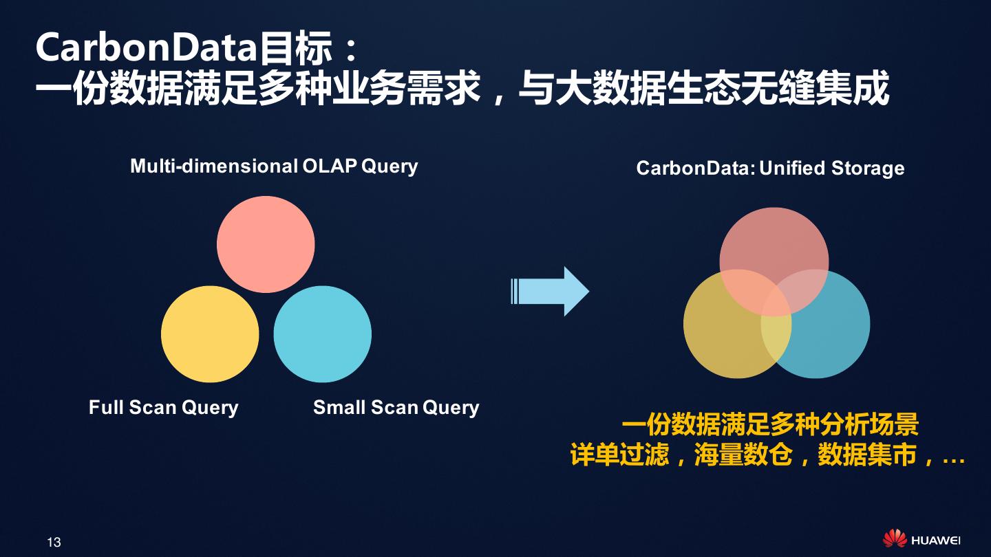 13 .CarbonData目标: 一份数据满足多种业务需求,与大数据生态无缝集成 Multi-dimensional OLAP Query CarbonData: Unified Storage Full Scan Query Small Scan Query 一份数据满足多种分析场景 详单过滤,海量数仓,数据集市,… 13