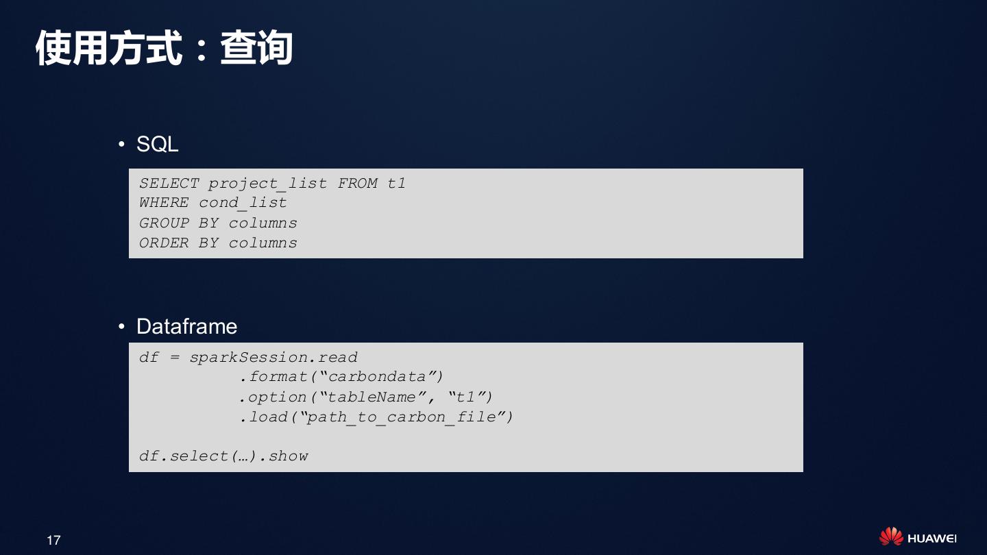 17 .使用方式:查询 • SQL SELECT project_list FROM t1 WHERE cond_list GROUP BY columns ORDER BY columns • Dataframe df = sparkSession.read .format(“carbondata”) .option(“tableName”, “t1”) .load(“path_to_carbon_file”) df.select(…).show 17