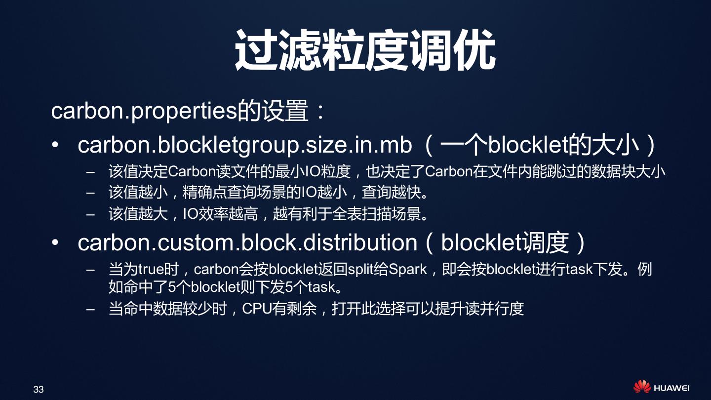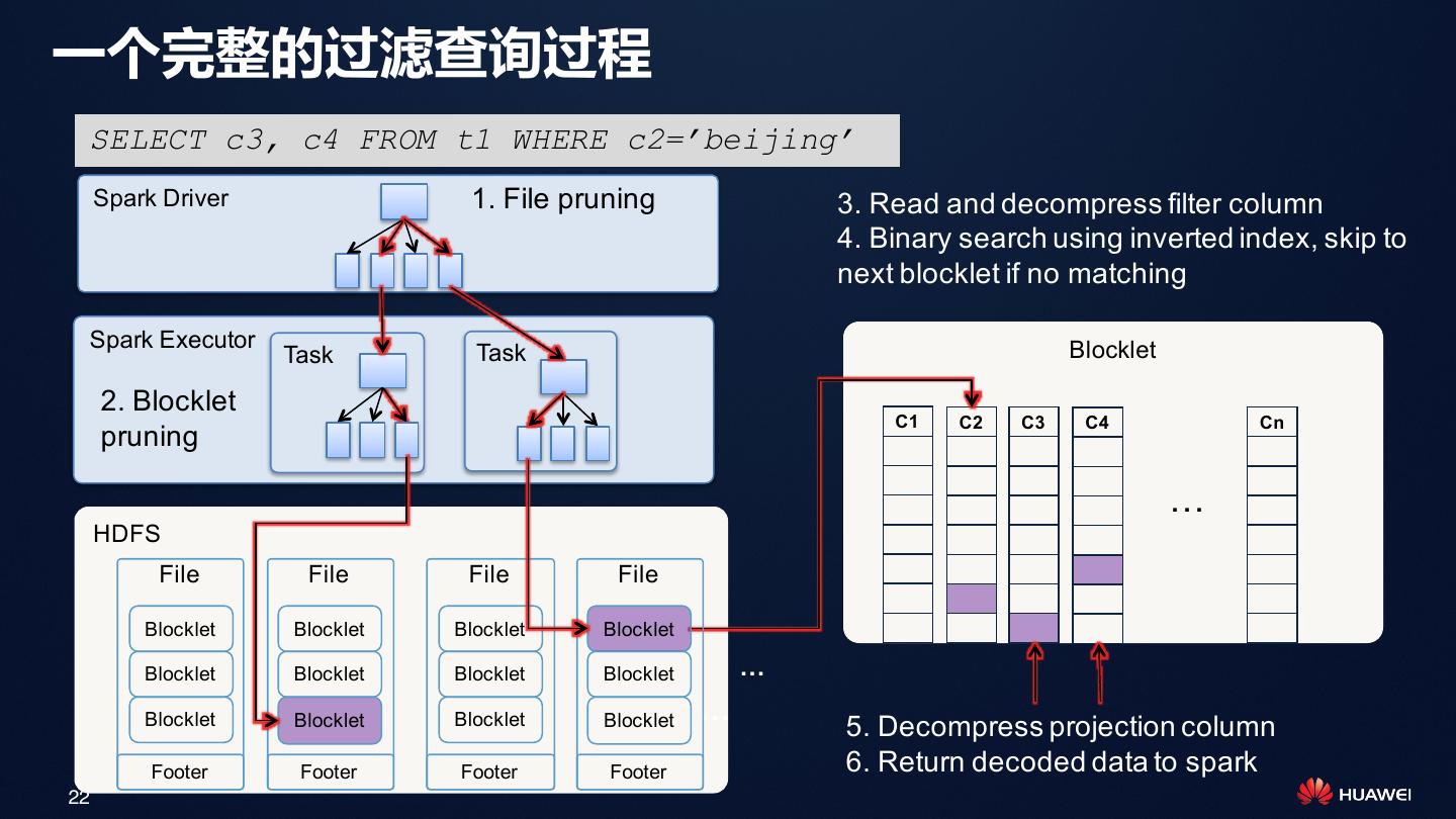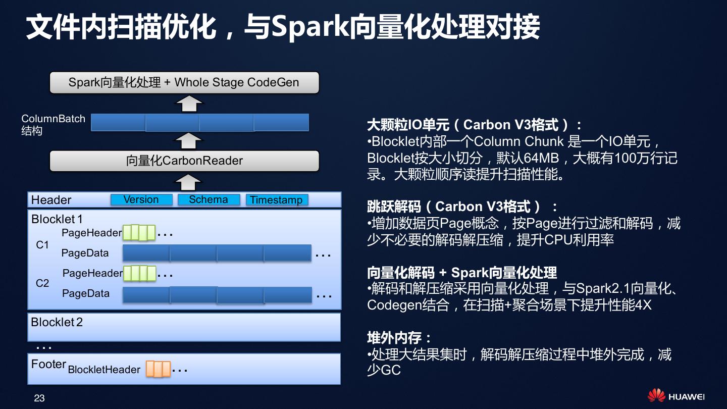22 .一个完整的过滤查询过程 SELECT c3, c4 FROM t1 WHERE c2=’beijing’ Spark Driver 1. File pruning 3. Read and decompress filter column 4. Binary search using inverted index, skip to next blocklet if no matching Spark Executor Blocklet Task Task 2. Blocklet C1 C2 C3 C4 Cn pruning … HDFS File File File File Blocklet Blocklet Blocklet Blocklet Blocklet Blocklet Blocklet Blocklet … Blocklet Blocklet Blocklet Blocklet … 5. Decompress projection column Footer Footer Footer Footer 6. Return decoded data to spark 22