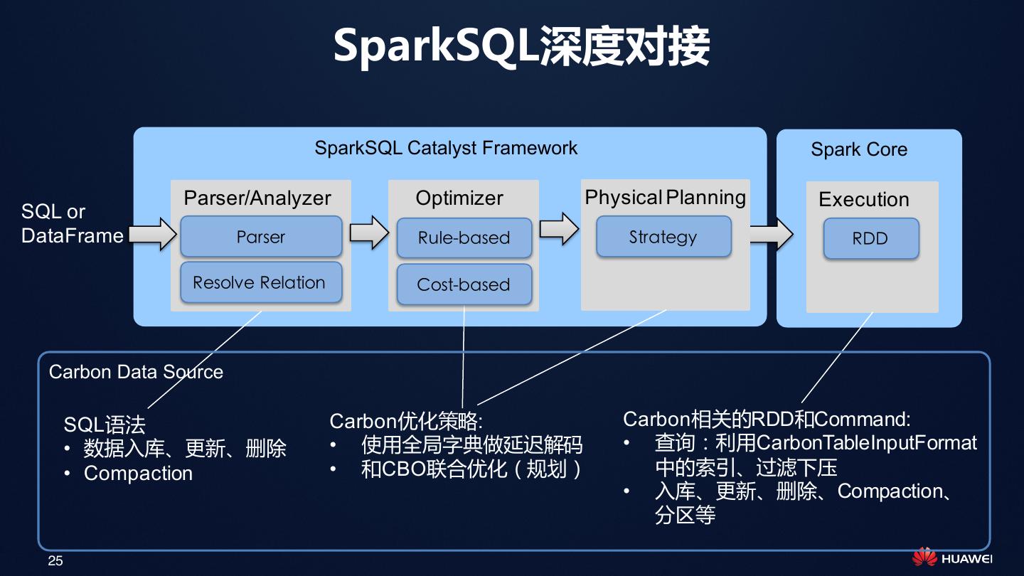 25 . SparkSQL深度对接 SparkSQL Catalyst Framework Spark Core Parser/Analyzer Optimizer Physical Planning Execution SQL or DataFrame Parser Rule-based Strategy RDD Resolve Relation Cost-based Carbon Data Source SQL语法 Carbon优化策略: Carbon相关的RDD和Command: • 数据入库、更新、删除 • 使用全局字典做延迟解码 • 查询:利用CarbonTableInputFormat • Compaction • 和CBO联合优化(规划) 中的索引、过滤下压 • 入库、更新、删除、Compaction、 分区等 25