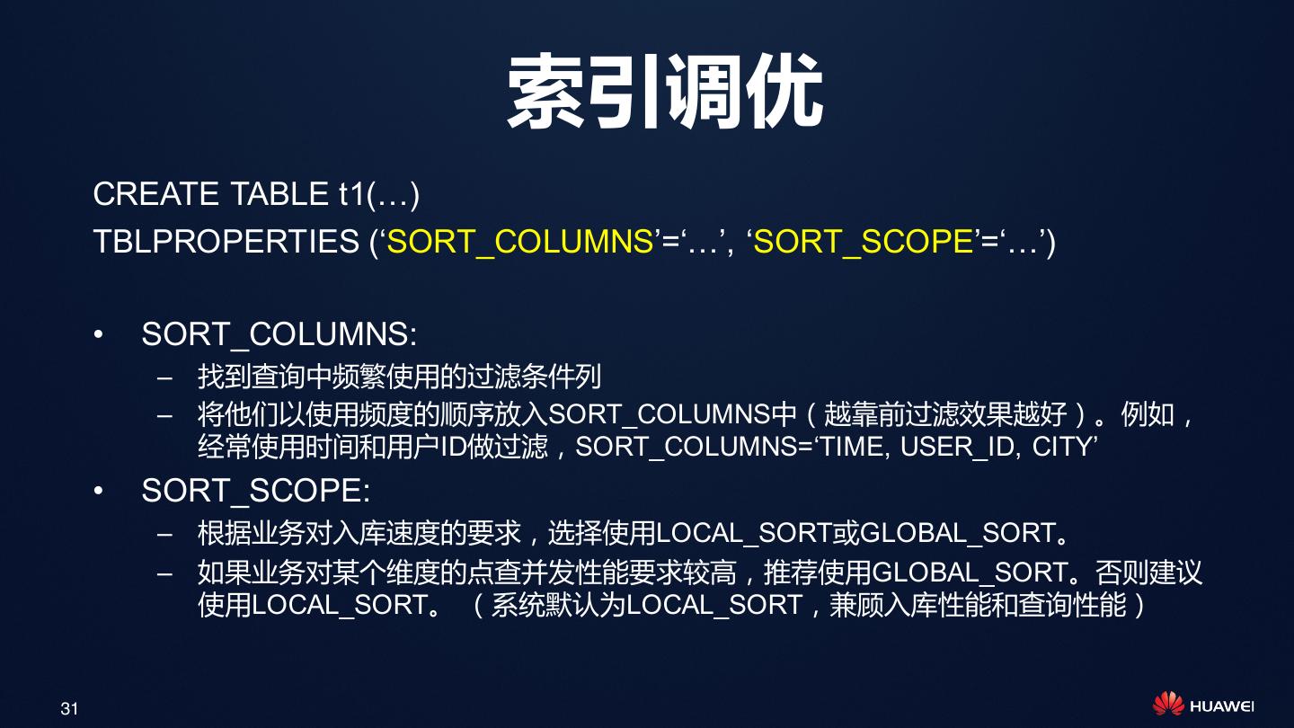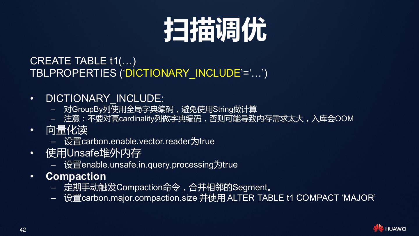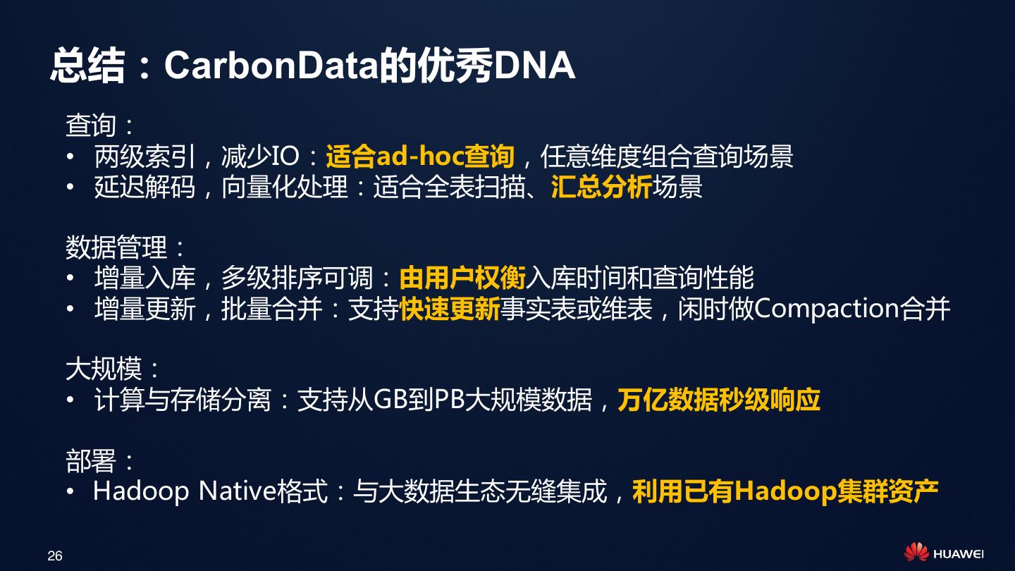 26 .总结:CarbonData的优秀DNA 查询: • 两级索引,减少IO:适合ad-hoc查询,任意维度组合查询场景 • 延迟解码,向量化处理:适合全表扫描、汇总分析场景 数据管理: • 增量入库,多级排序可调:由用户权衡入库时间和查询性能 • 增量更新,批量合并:支持快速更新事实表或维表,闲时做Compaction合并 大规模: • 计算与存储分离:支持从GB到PB大规模数据,万亿数据秒级响应 部署: • Hadoop Native格式:与大数据生态无缝集成,利用已有Hadoop集群资产 26