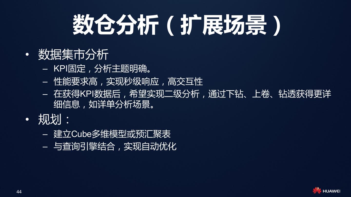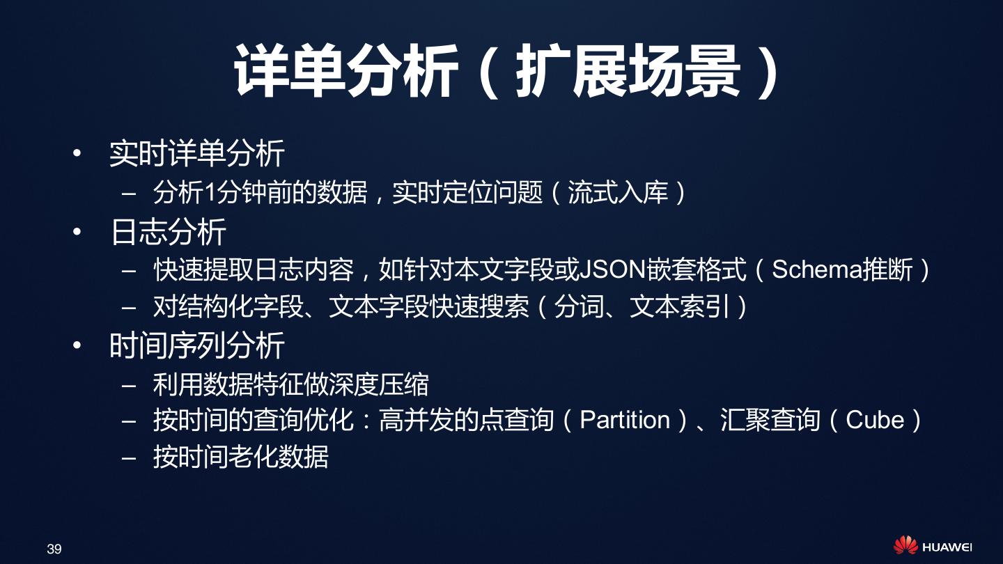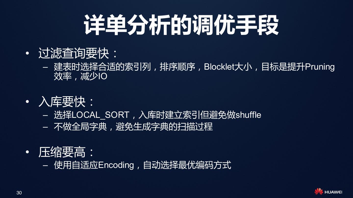 29 . 应用场景1:详单分析 业务:详单分析(明细数据ad-hoc查询),例如:事件日志分析,用户行为分析,流水表查询 业务诉求: • 入库:详单来得快,要快速入库,>10万记录每秒每节点 • 存储:单表数据量大,存储N年数据,压缩率越高越好,存储成本压力大 • 查询: • 多条件灵活过滤,一般提供界面让用户选择条件 • 精确匹配,模糊匹配 • 事实表Join维度表,例如替换用户ID • 最终输出:明细数据或对结果轻度汇总 分钟级入库 29
