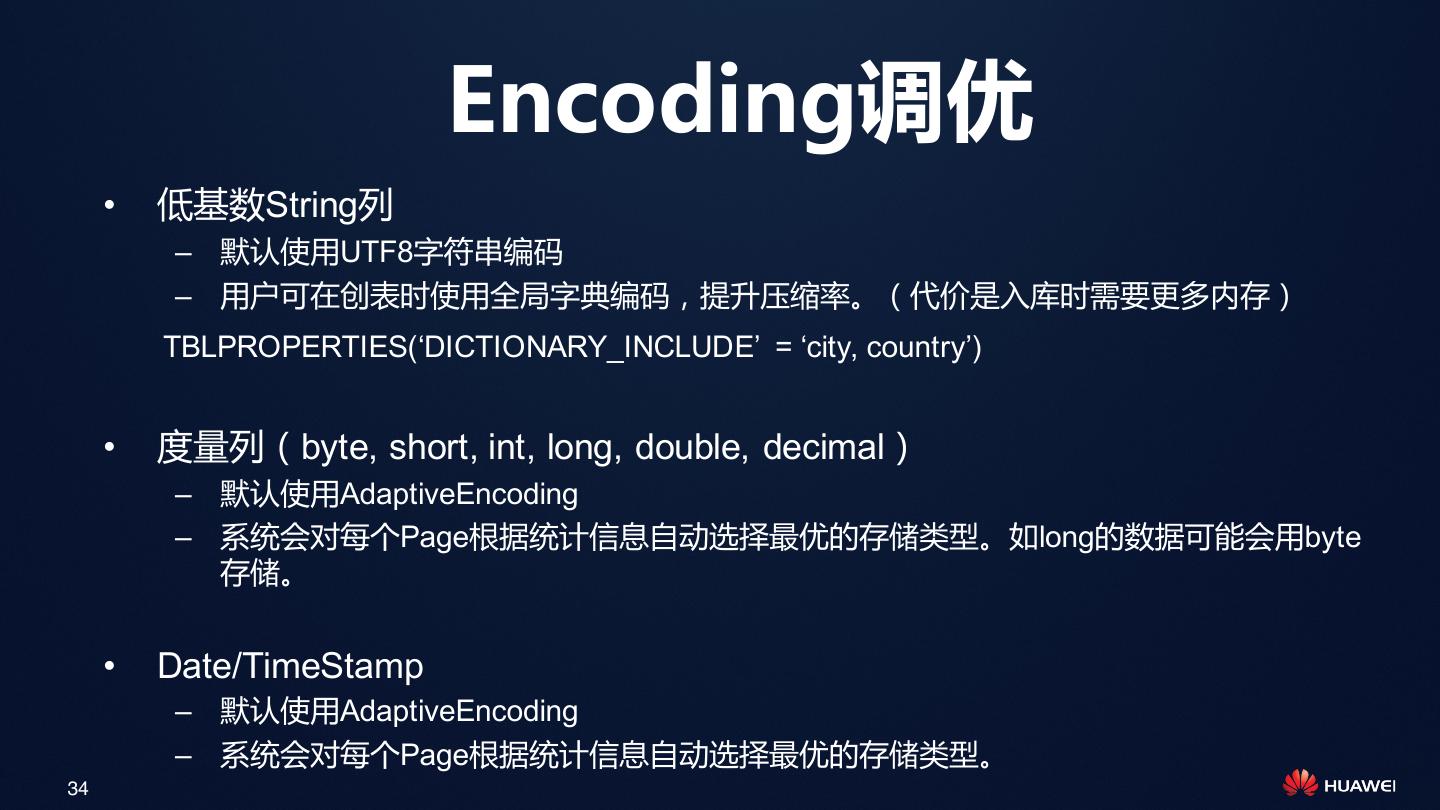 23 .文件内扫描优化,与Spark向量化处理对接 Spark向量化处理 + Whole Stage CodeGen ColumnBatch 结构 大颗粒IO单元(Carbon V3格式): •Blocklet内部一个Column Chunk 是一个IO单元, 向量化CarbonReader Blocklet按大小切分,默认64MB,大概有100万行记 录。大颗粒顺序读提升扫描性能。 Header Version Schema Timestamp 跳跃解码(Carbon V3格式) : Blocklet 1 •增加数据页Page概念,按Page进行过滤和解码,减 PageHeader … 少不必要的解码解压缩,提升CPU利用率 C1 PageData … PageHeader … 向量化解码 + Spark向量化处理 C2 PageData … •解码和解压缩采用向量化处理,与Spark2.1向量化、 Codegen结合,在扫描+聚合场景下提升性能4X Blocklet 2 … 堆外内存: •处理大结果集时,解码解压缩过程中堆外完成,减 Footer BlockletHeader … 少GC 23