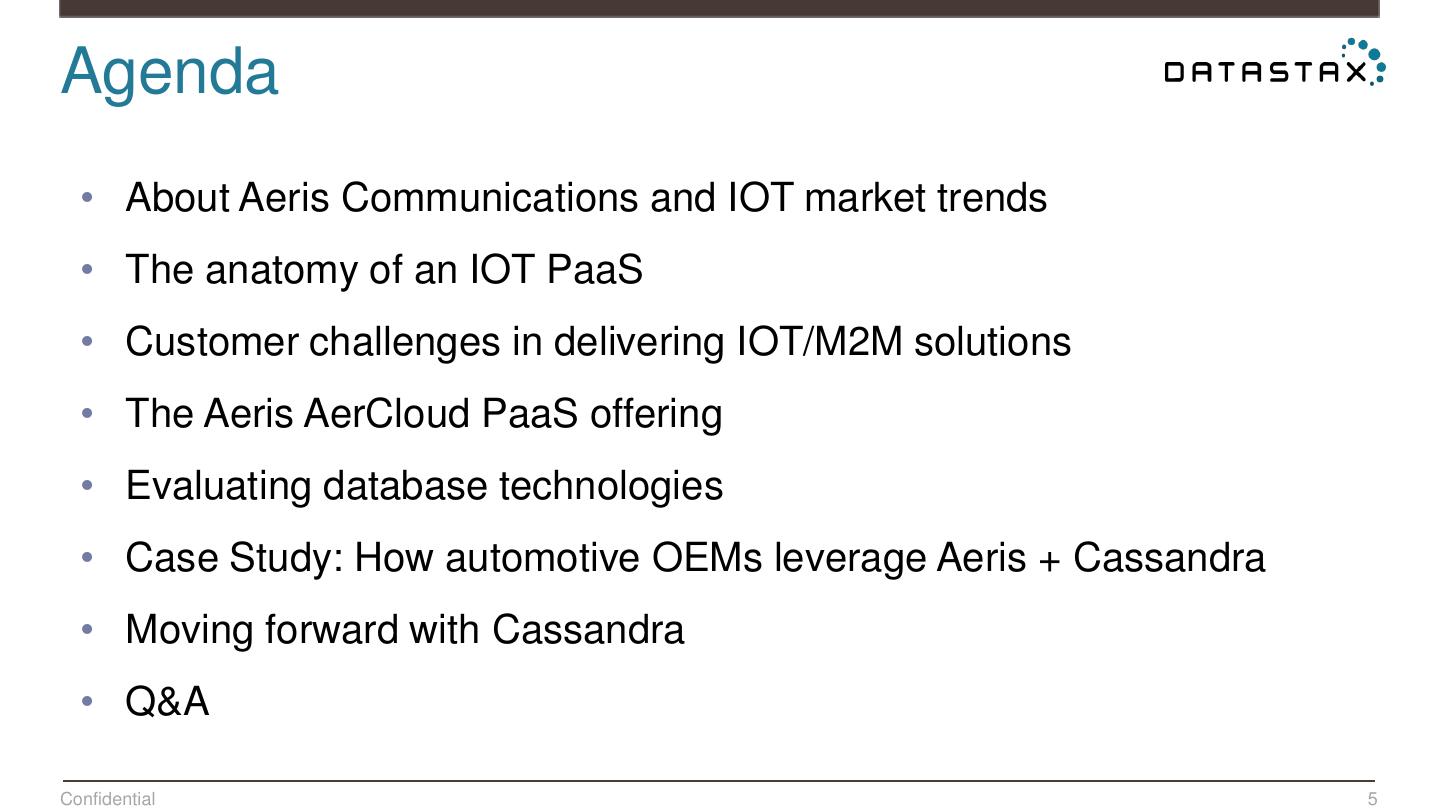 5 .Agenda • About Aeris Communications and IOT market trends • The anatomy of an IOT PaaS • Customer challenges in delivering IOT/M2M solutions • The Aeris AerCloud PaaS offering • Evaluating database technologies • Case Study: How automotive OEMs leverage Aeris + Cassandra • Moving forward with Cassandra • Q&A Confidential 5