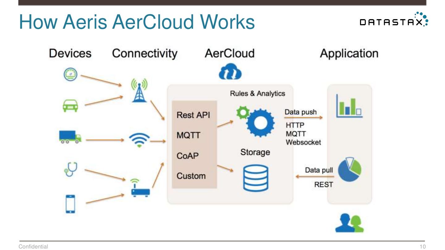 9 .Customer Challenges w/o PaaS • Customer developers focused on infrastructure rather than differentiating features - suffering frequent downtimes • Data intake volume (Aeris: Grew from 1B transactions/year to almost 1B per day!) • HIPAA / Data location compliance • Need to derive more value from the data being captured • Wild Wild West on device protocols – have to adapt easily Confidential 9