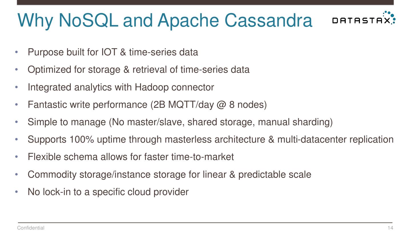 13 .Why Not Relational Databases • Costly/Complex to scale – especially w/ HA • Manual sharding at scale is a pain • Inflexible data model – can’t handle IoT variety of data Confidential 13