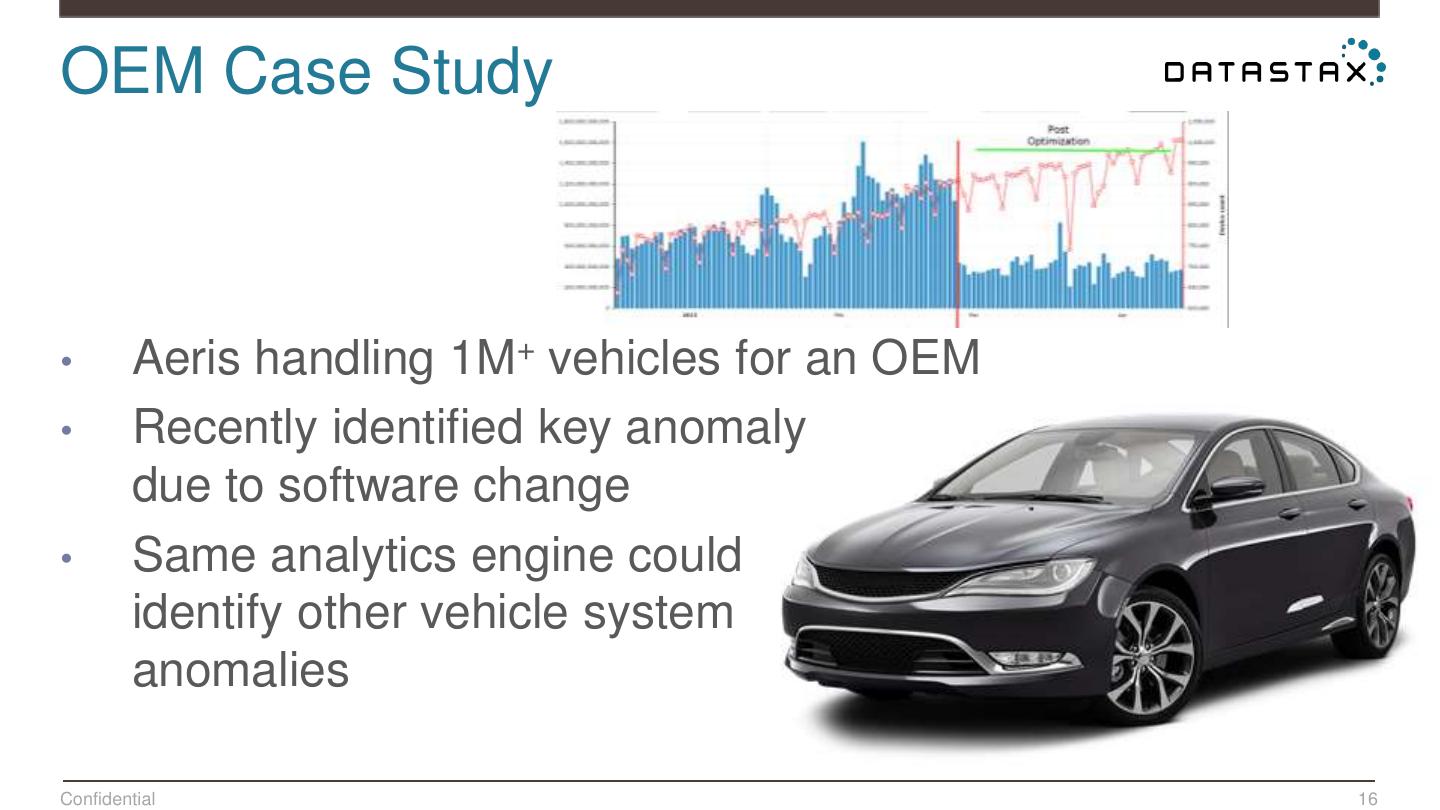 16 .OEM Case Study • Aeris handling 1M+ vehicles for an OEM • Recently identified key anomaly due to software change • Same analytics engine could identify other vehicle system anomalies Confidential 16