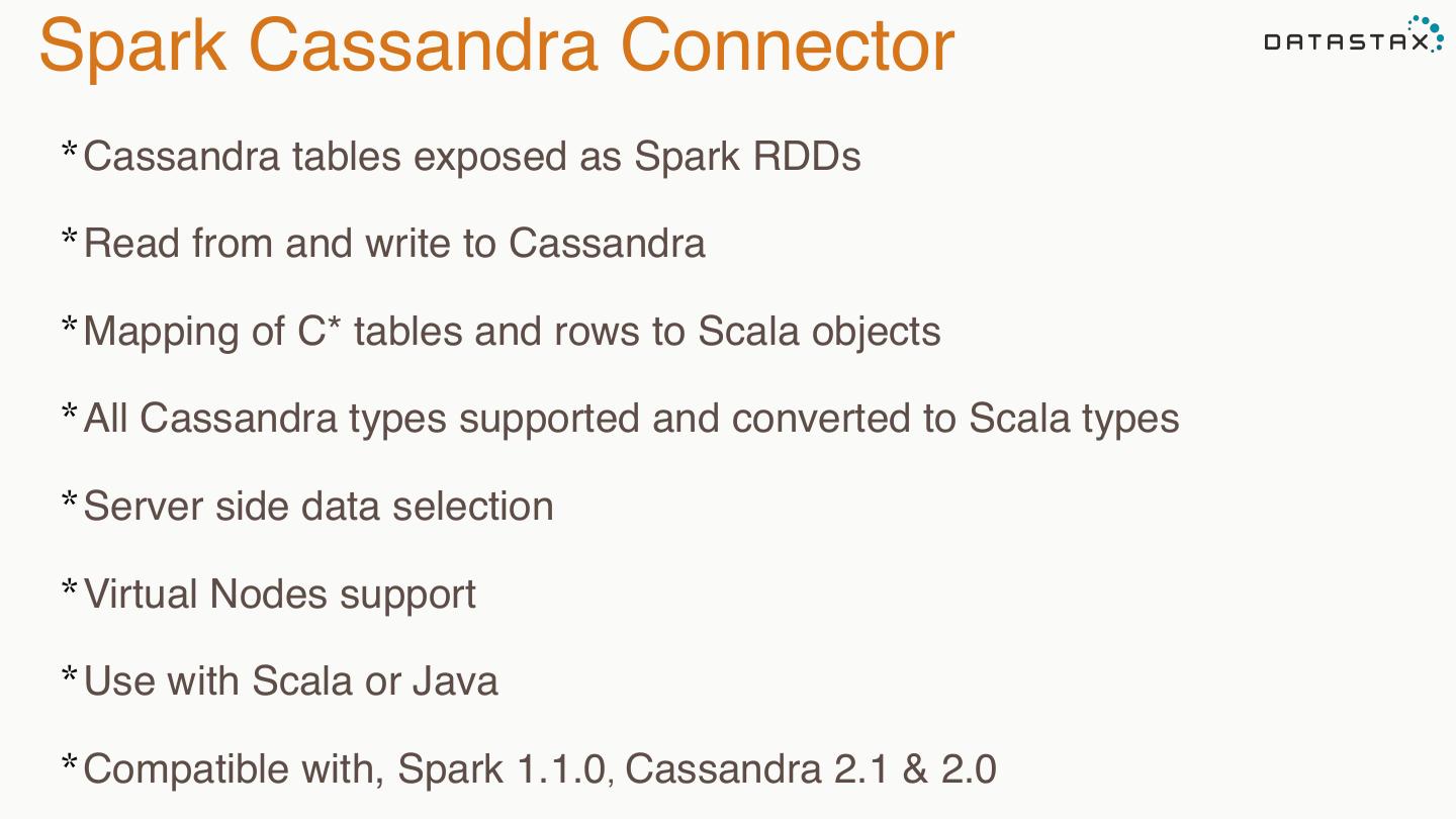 19 .Spark Cassandra Connector *Cassandra tables exposed as Spark RDDs *Read from and write to Cassandra *Mapping of C* tables and rows to Scala objects *All Cassandra types supported and converted to Scala types *Server side data selection *Virtual Nodes support *Use with Scala or Java *Compatible with, Spark 1.1.0, Cassandra 2.1 & 2.0