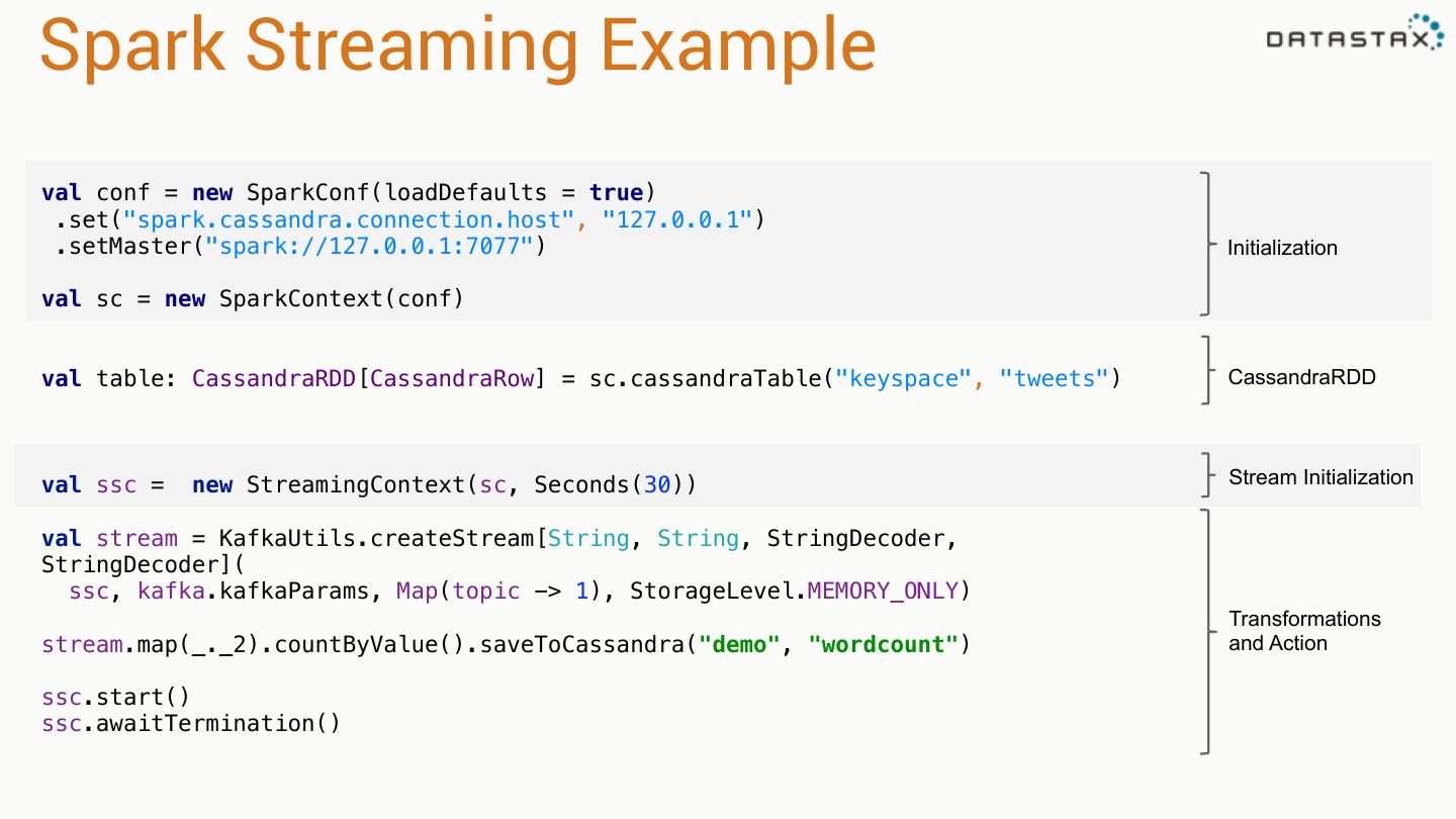23 .Saving Data val newRdd = sc.parallelize(Seq(("cat", 40), ("fox", 50))) // newRdd: org.apache.spark.rdd.RDD[(String, Int)] = ParallelCollectionRDD[2] newRdd.saveToCassandra("test", "words", Seq("word", "count")) * RDD above saved to Cassandra: SELECT * FROM test.words; word | count ------+------- bar | 30 foo | 20 cat | 40 fox | 50 (4 rows)