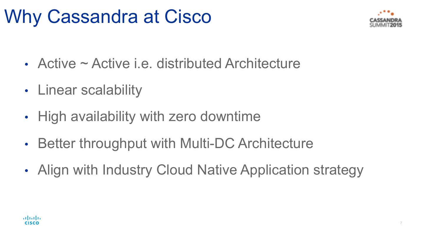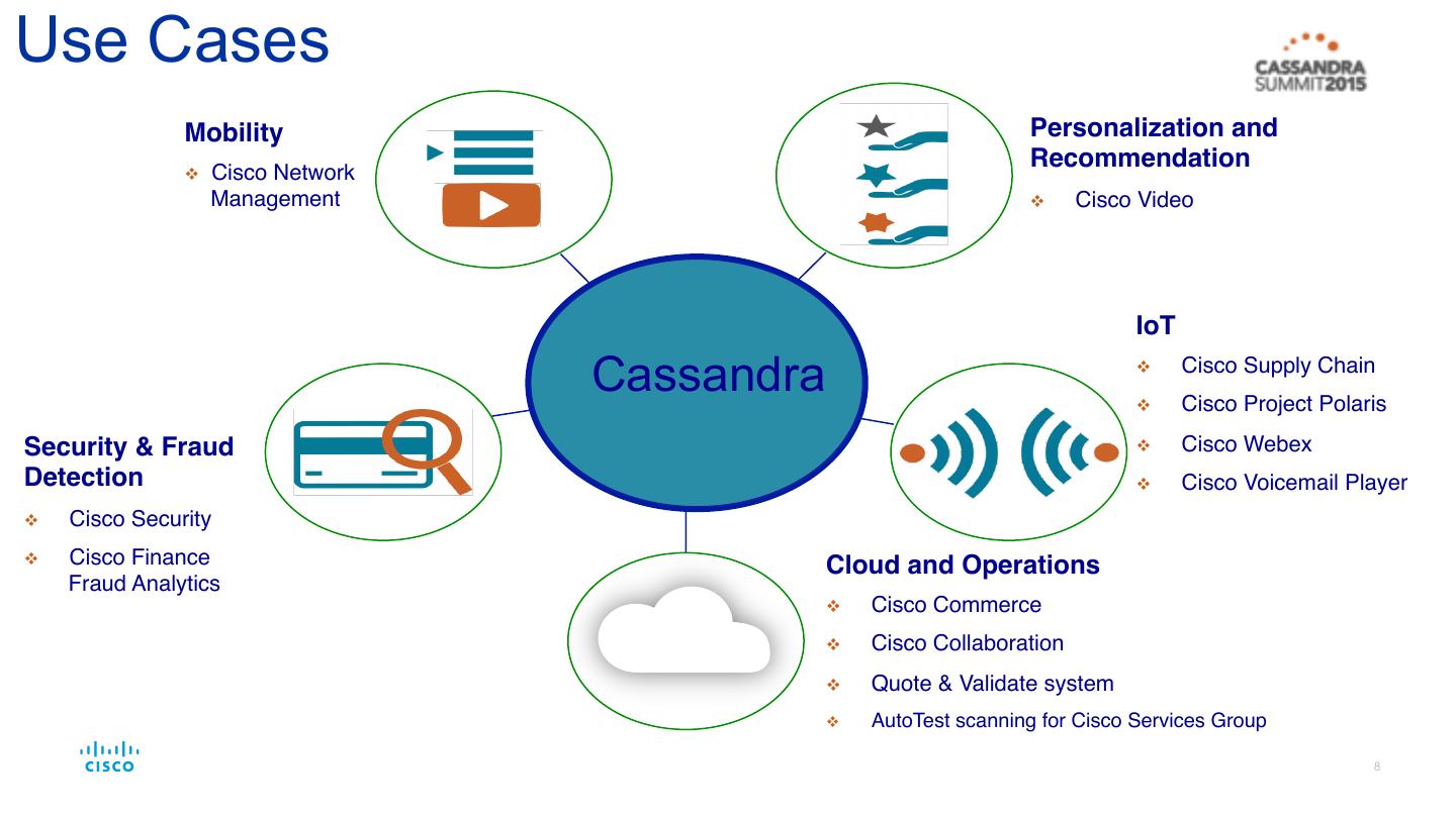 7 .Why Cassandra at Cisco • Active ~ Active i.e. distributed Architecture • Linear scalability • High availability with zero downtime • Better throughput with Multi-DC Architecture • Align with Industry Cloud Native Application strategy 7