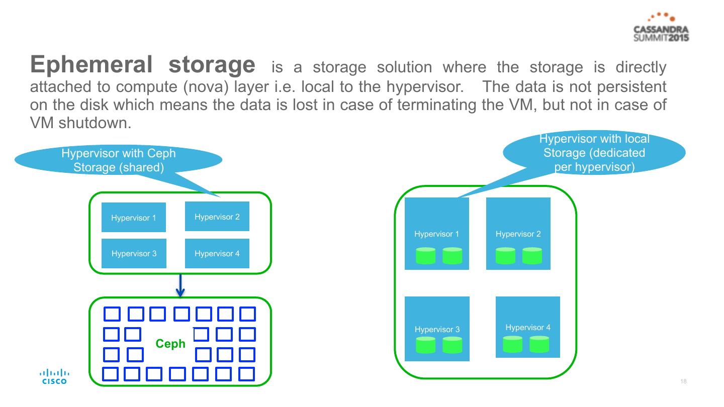 18 .Ephemeral storage is a storage solution where the storage is directly attached to compute (nova) layer i.e. local to the hypervisor. The data is not persistent on the disk which means the data is lost in case of terminating the VM, but not in case of VM shutdown. Hypervisor with local Hypervisor with Ceph Storage (dedicated Storage (shared) per hypervisor) Hypervisor 1 Hypervisor 2 Hypervisor 1 Hypervisor 2 Hypervisor 3 Hypervisor 4 Hypervisor 3 Hypervisor 4 Ceph 18