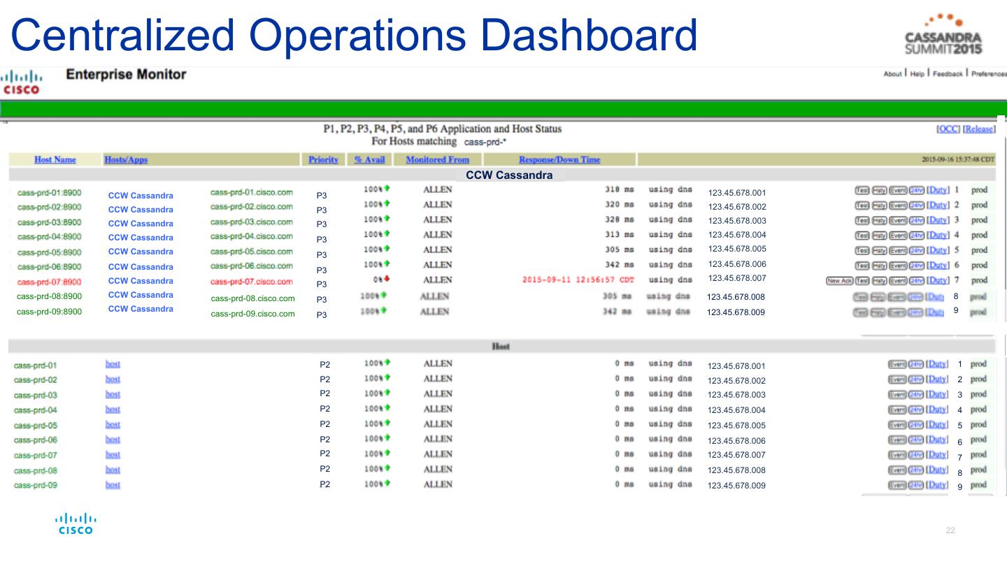 22 .Centralized Operations Dashboard CCW Cassandra CCW Cassandra P3 123.45.678.001 CCW Cassandra P3 123.45.678.002 CCW Cassandra P3 123.45.678.003 CCW Cassandra 123.45.678.004 P3 CCW Cassandra 123.45.678.005 P3 CCW Cassandra 123.45.678.006 P3 CCW Cassandra 123.45.678.007 P3 cass-prd-08:8900 CCW Cassandra cass-prd-08.cisco.com 123.45.678.008 8 P3 cass-prd-09:8900 CCW Cassandra 123.45.678.009 9 cass-prd-09.cisco.com P3 P2 123.45.678.001 1 P2 123.45.678.002 2 P2 123.45.678.003 3 P2 123.45.678.004 4 P2 123.45.678.005 5 P2 123.45.678.006 6 P2 123.45.678.007 7 P2 123.45.678.008 8 P2 123.45.678.009 9 22