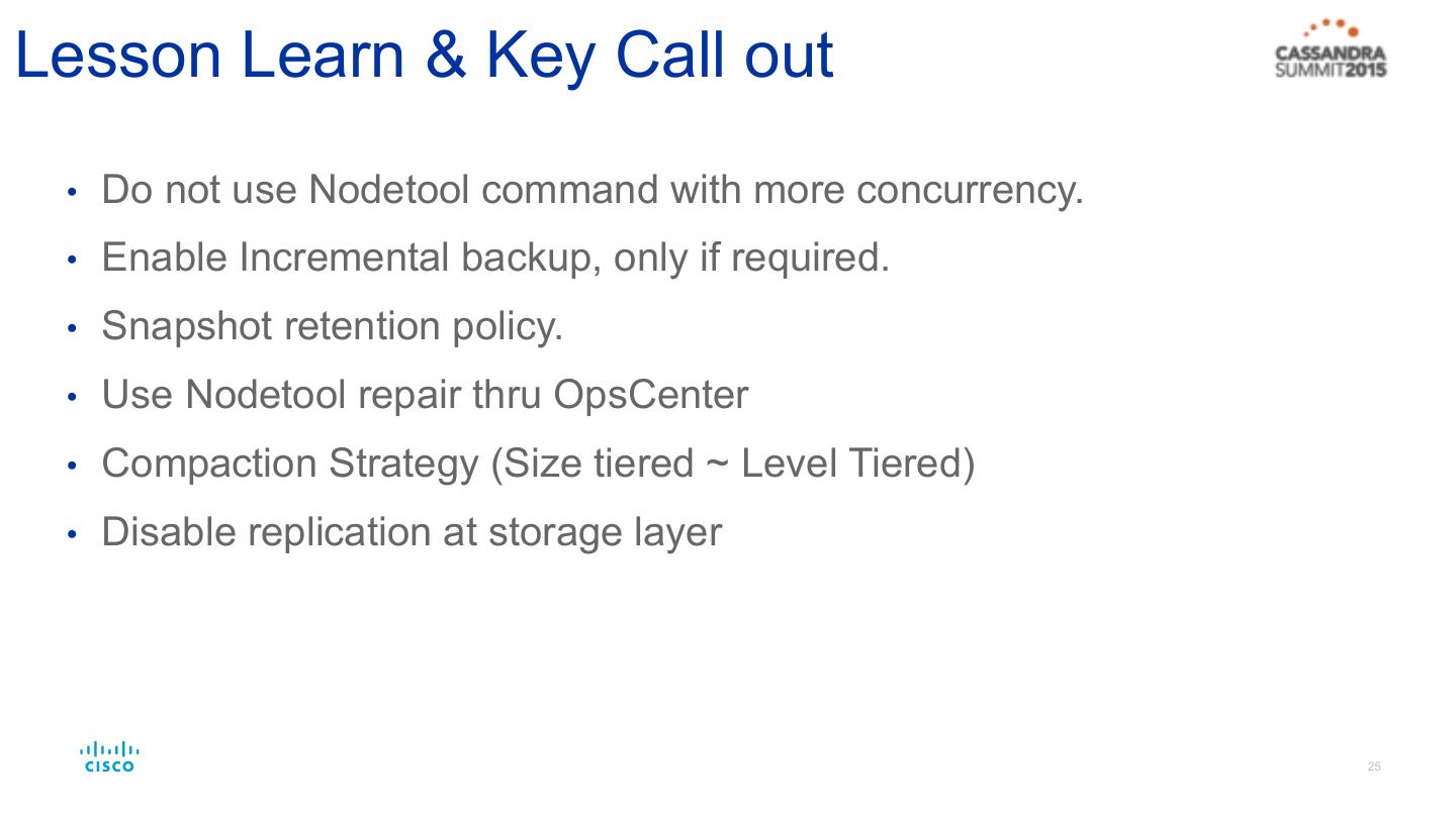 25 .Lesson Learn & Key Call out • Do not use Nodetool command with more concurrency. • Enable Incremental backup, only if required. • Snapshot retention policy. • Use Nodetool repair thru OpsCenter • Compaction Strategy (Size tiered ~ Level Tiered) • Disable replication at storage layer 25